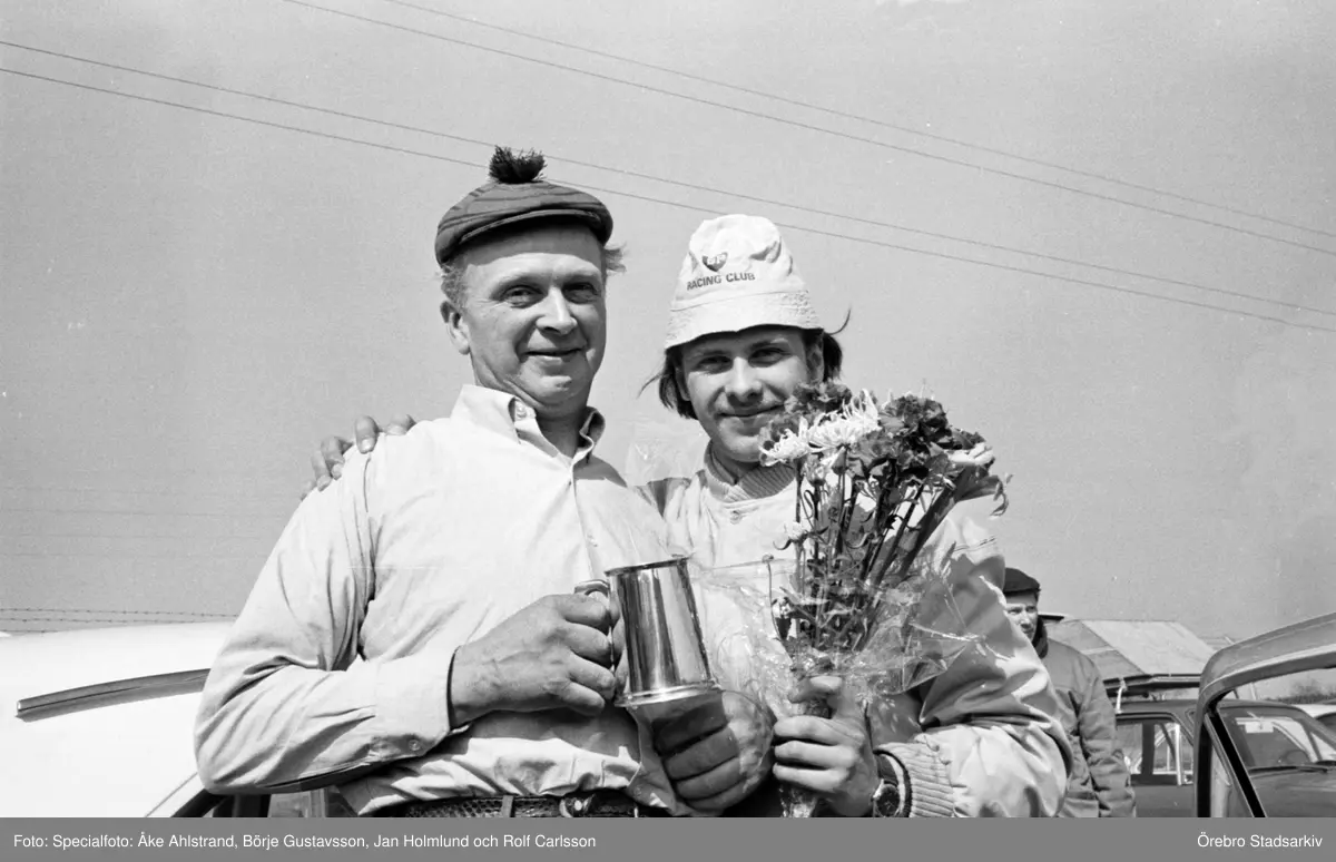 Segraren får blombukett. Karlskoga motorstadion, 1969-05-03