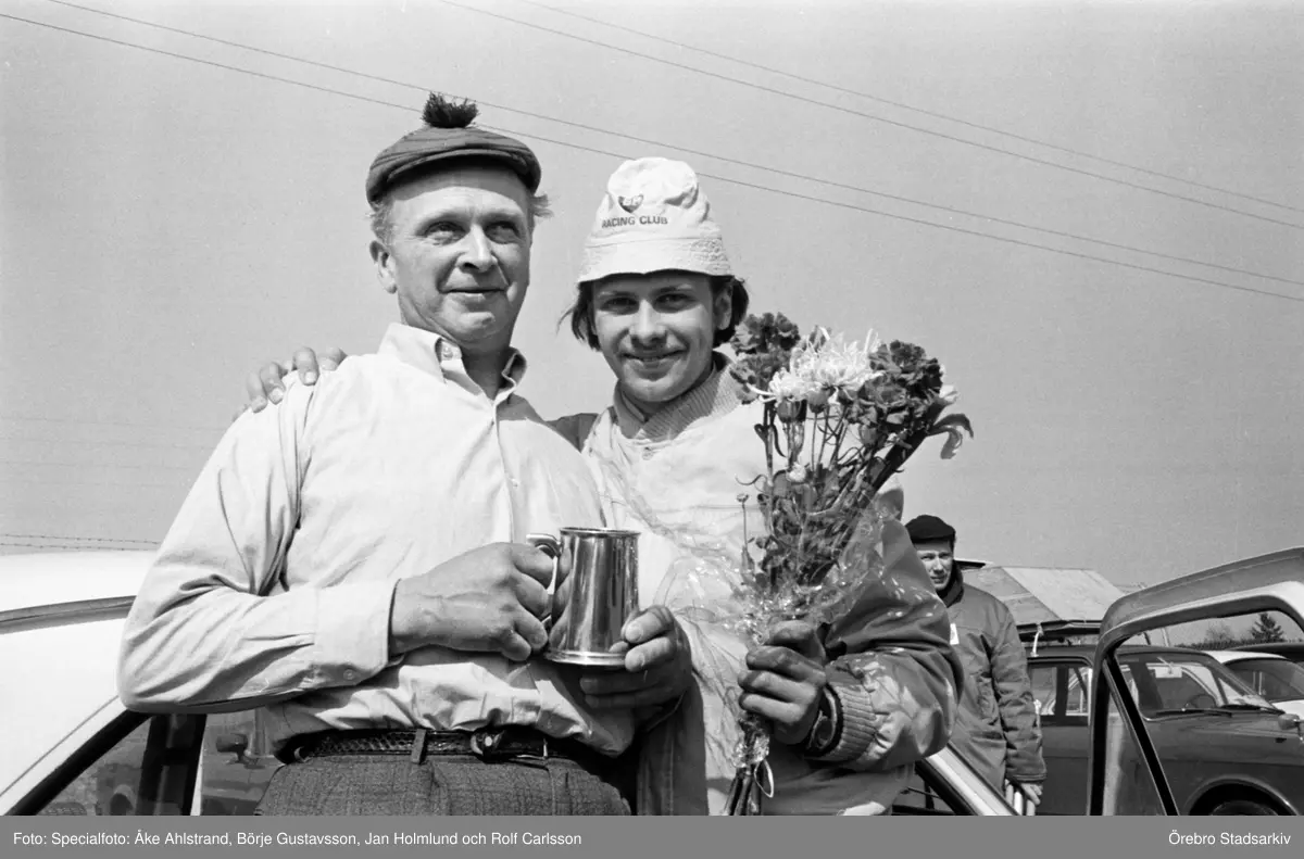 Segraren får blombukett. Karlskoga motorstadion, 1969-05-03