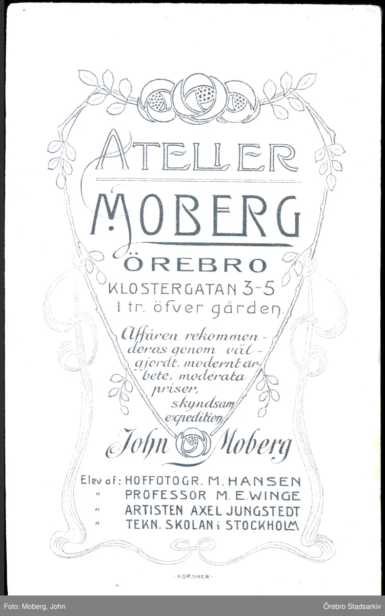 Baksida till visitkort från Atelier Moberg, omkring 1900