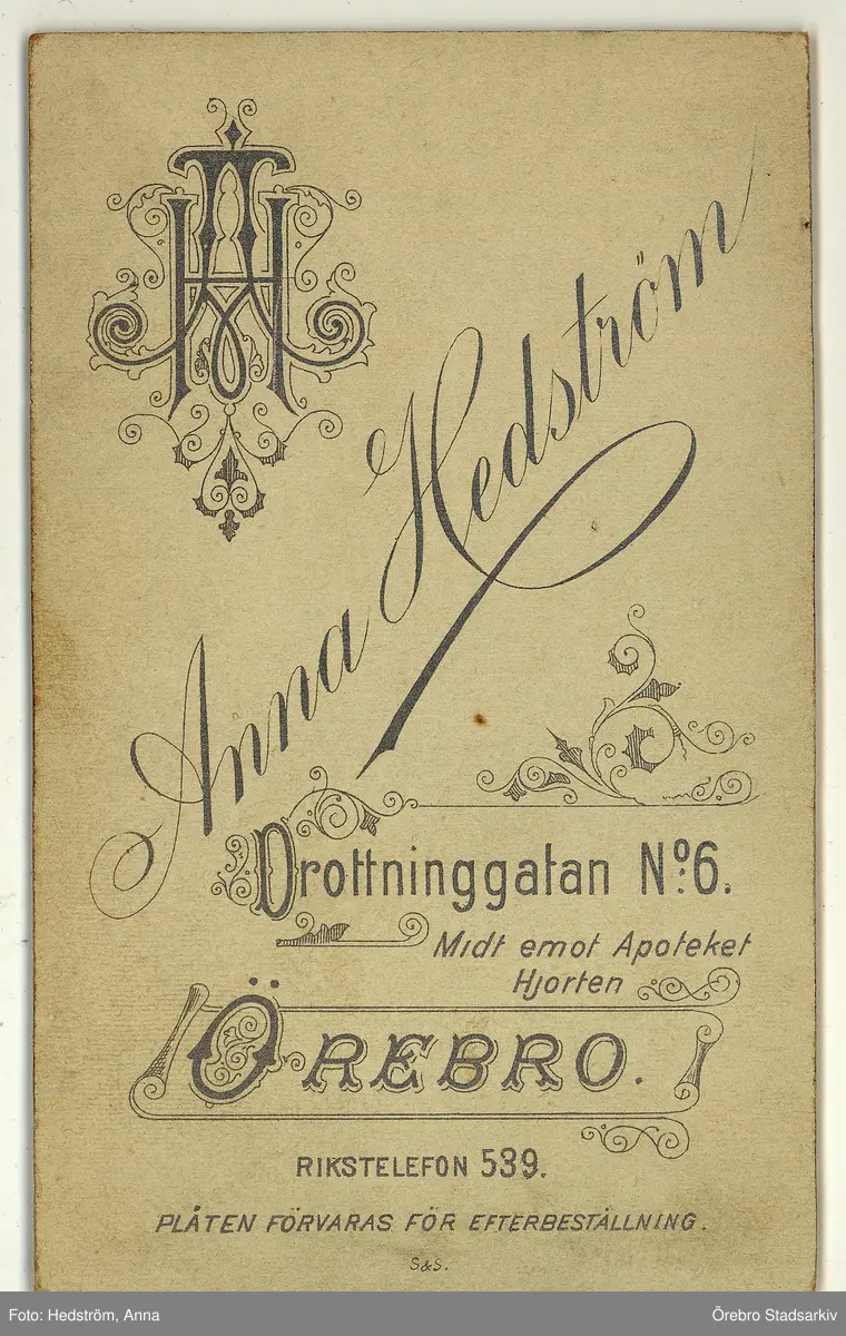 Titel: Baksida till visitkort från Anna Hedström, efter 1890