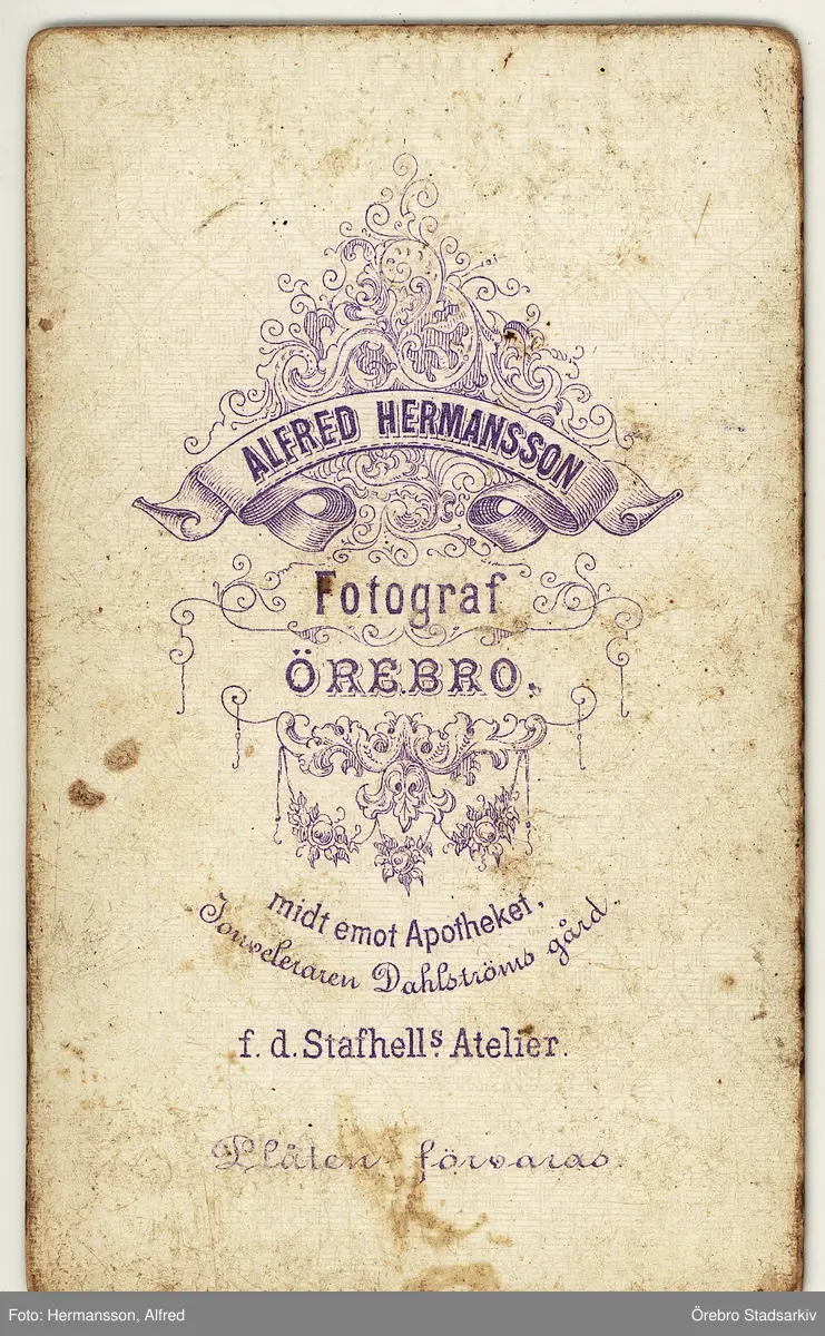 Baksida till visitkort från Alfred Hermansson, efter 1875