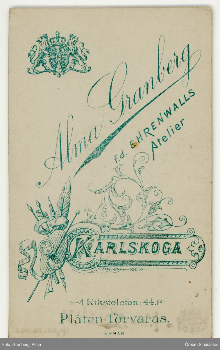 Baksida till visitkort från Alma Granberg i Karlskoga, efter 1898