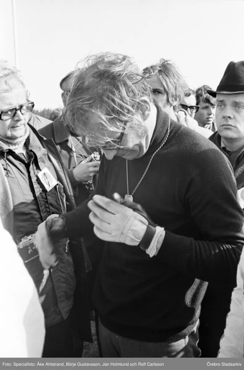 Förare bland fotografer och journalister. Karlskoga motorstadion, 1969-05-03
