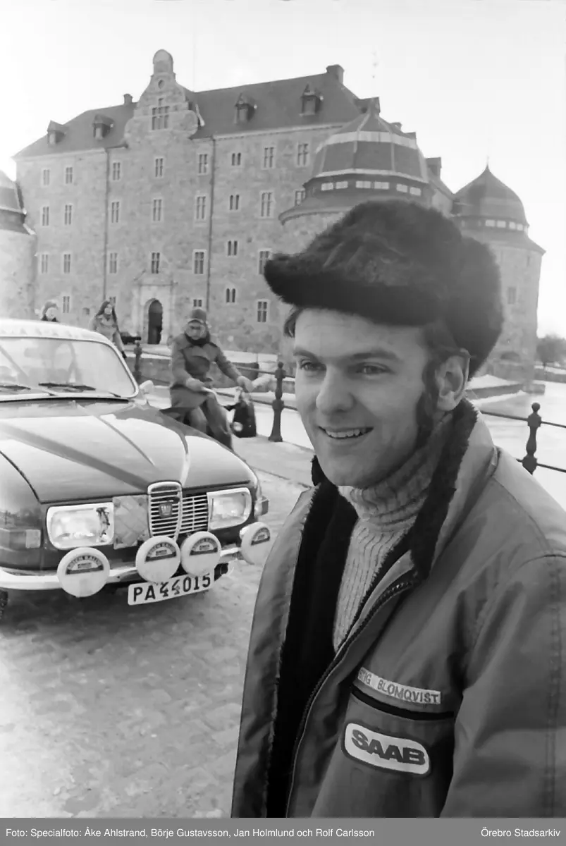 Titel: Rallysegaren poserar framför Örebro slott, 1971-03-04