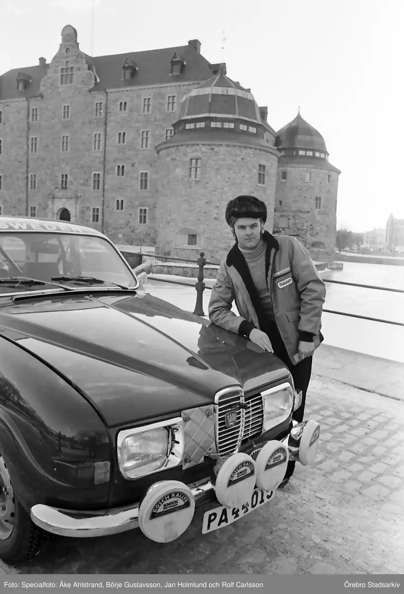 Rallysegaren poserar framför Örebro slott, 1971-03-04