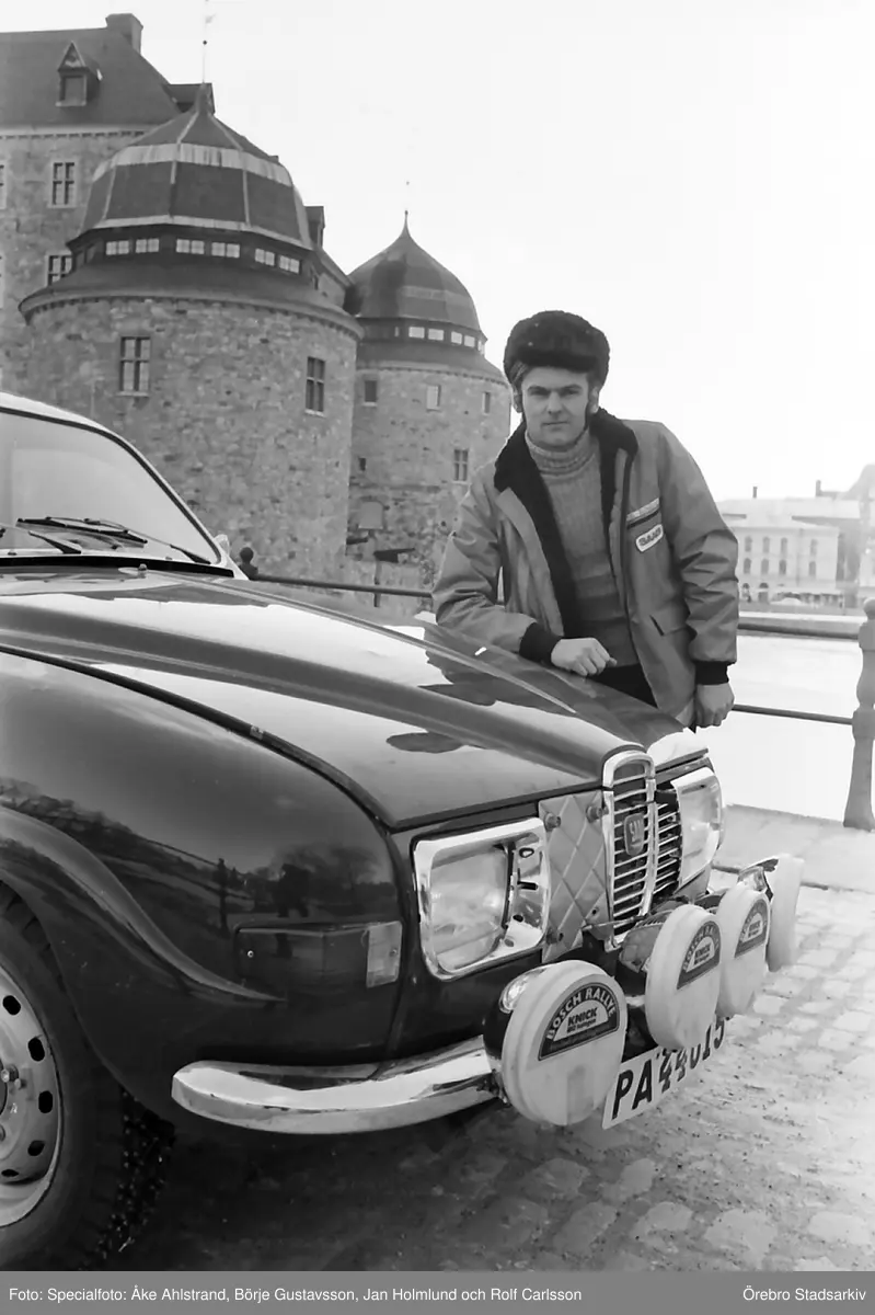 Rallysegaren poserar framför Örebro slott, 1971-03-04