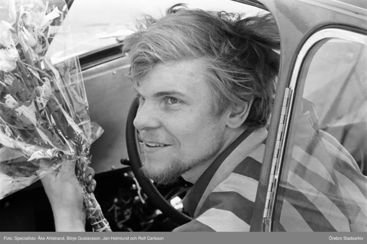Titel: Glad förare i B-finalen. Karlskoga motorstadion, 1969-05-03