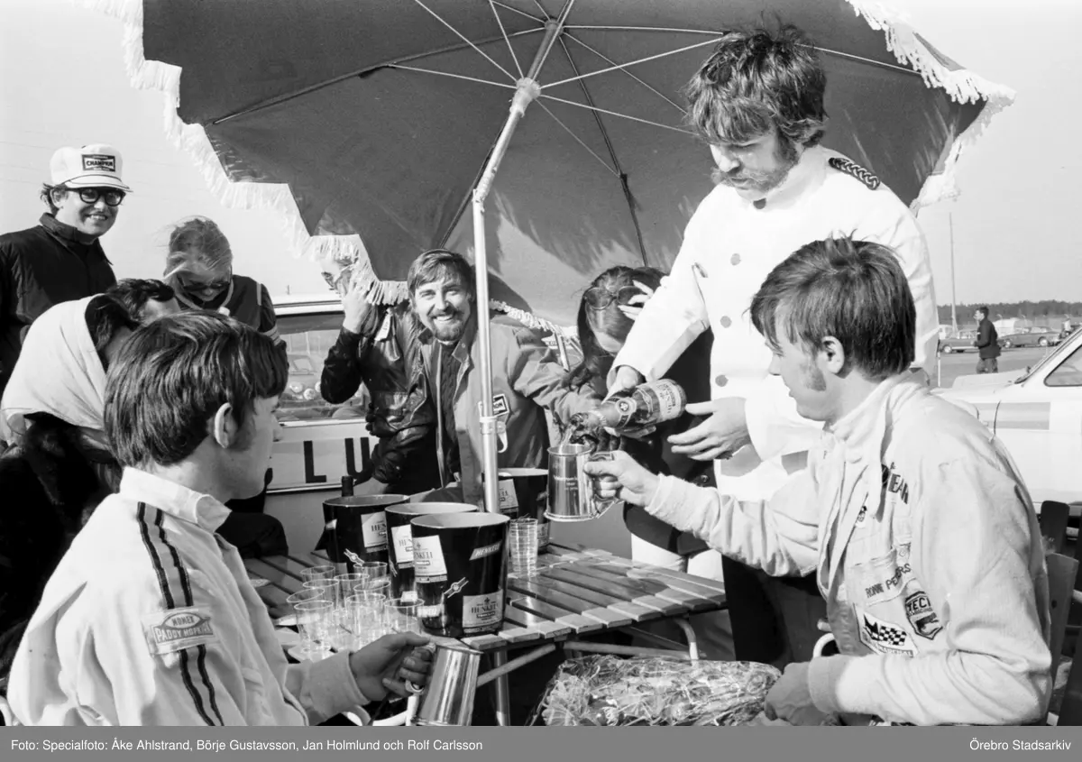 Segerchampagnen serveras. Karlskoga motorstadion, 1969-05-03