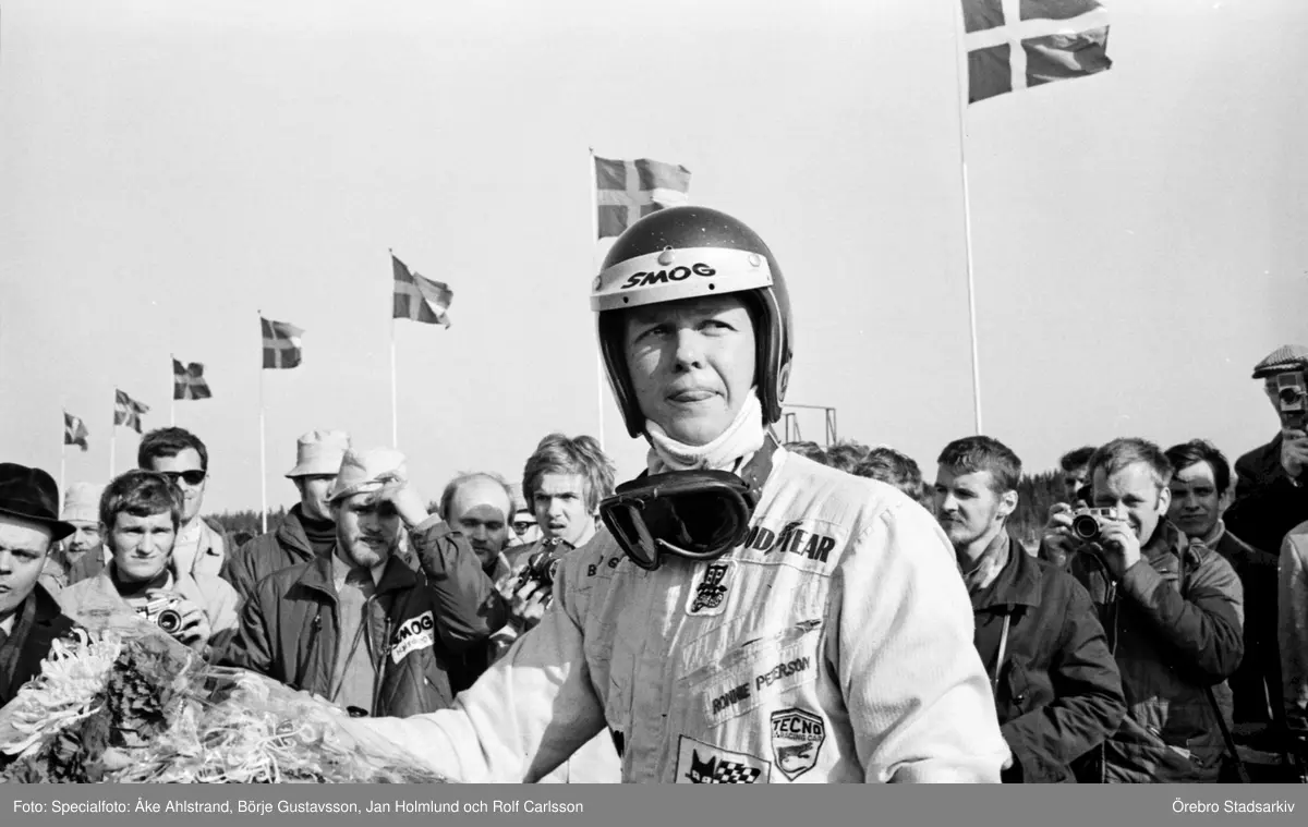 Ronnie Peterson med tungan rätt i munnen på Karlskoga motorstadion, 1969-05-03