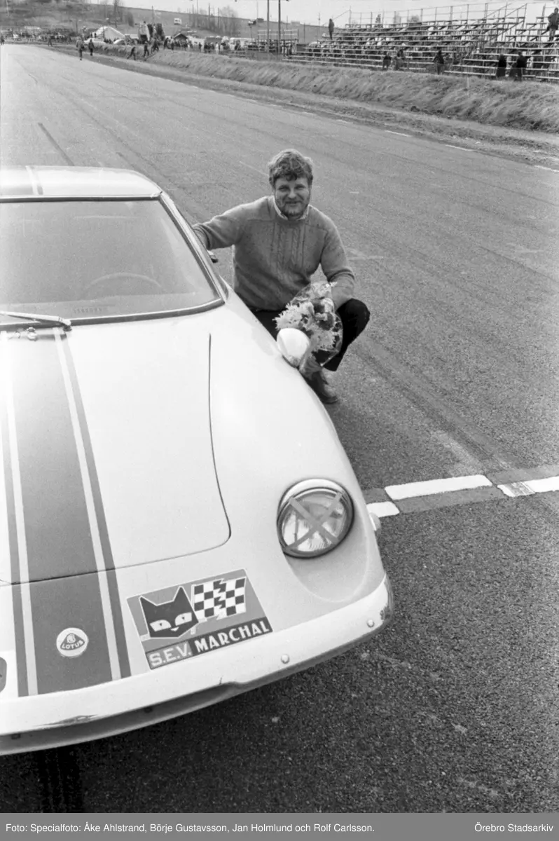 Segraren vid sin Lotus. Velodromloppet. Karlskoga motorstadion. 1969-05-03