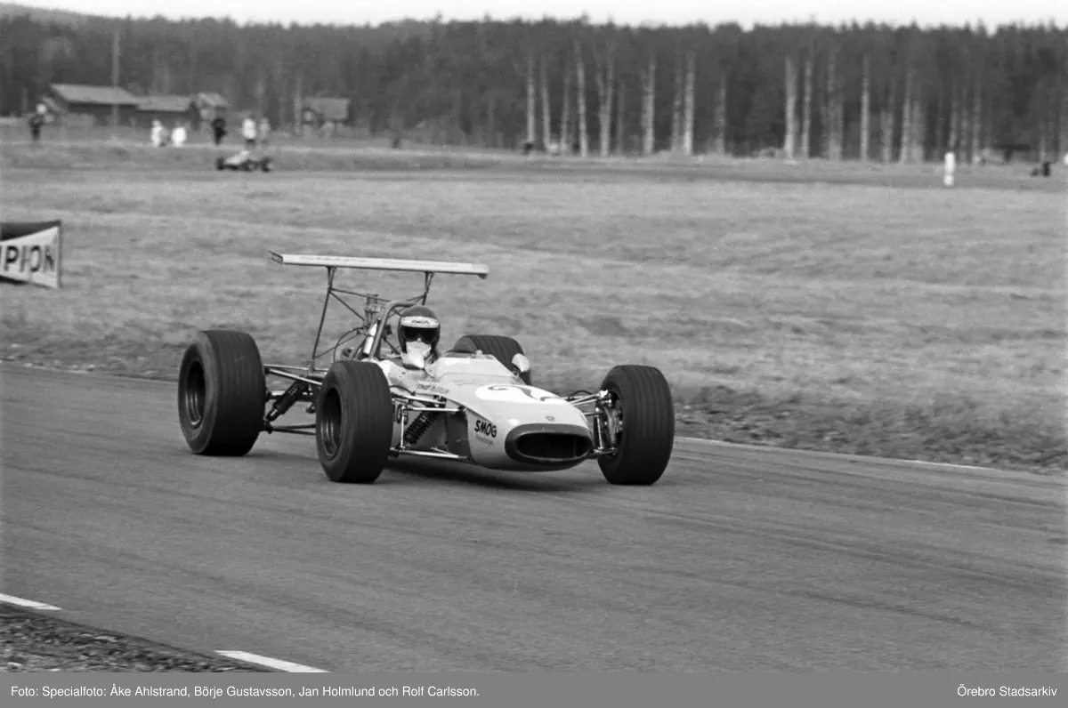Liten bil och stor vinge. Velodromloppet, Tecno 69. Karlskoga motorstadion. 1969-05-03