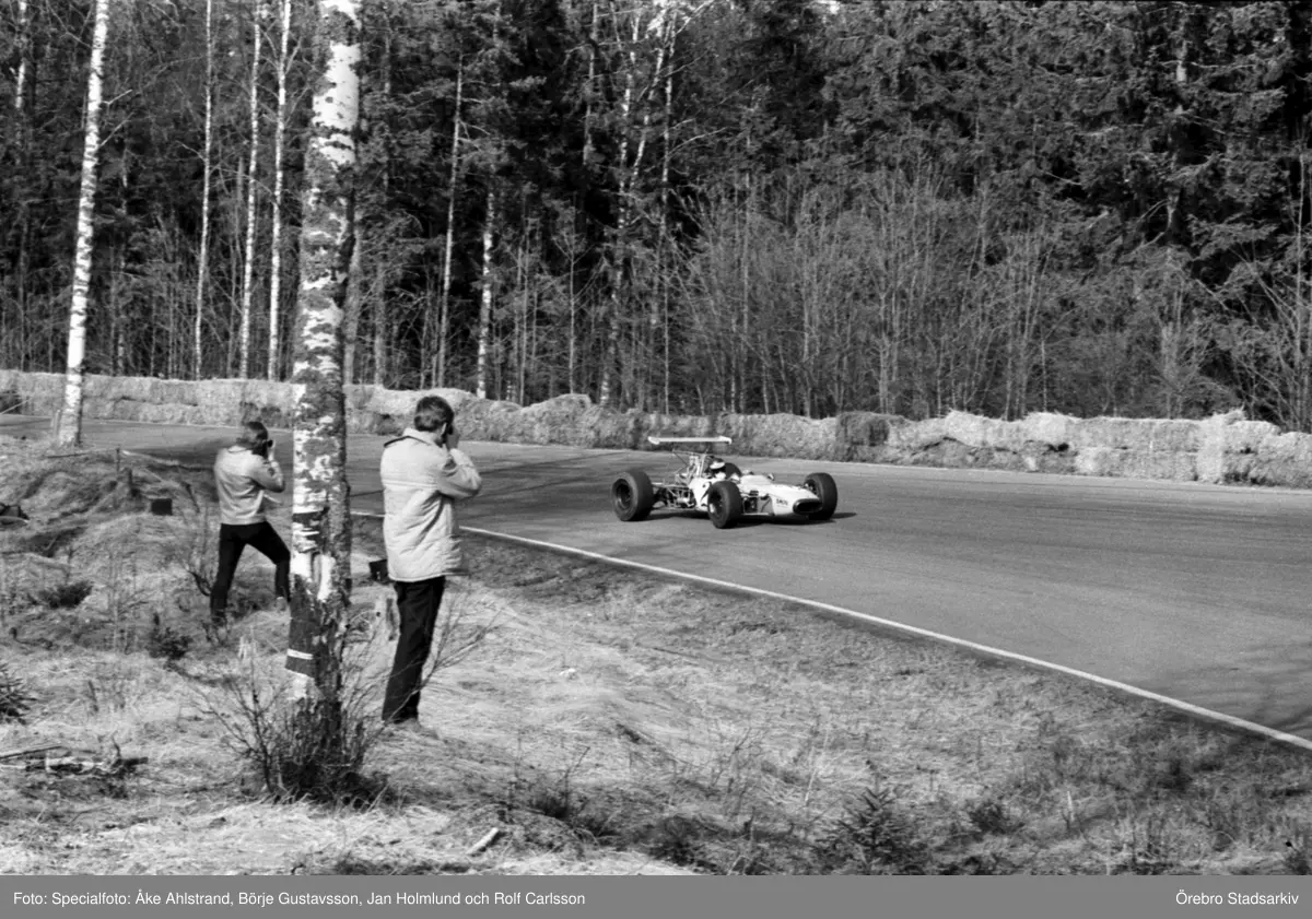 Fotografer på vägkanter fotar Ronnie som kör mot överlägsen seger på Karlskoga motorstadion, 1969-05-03