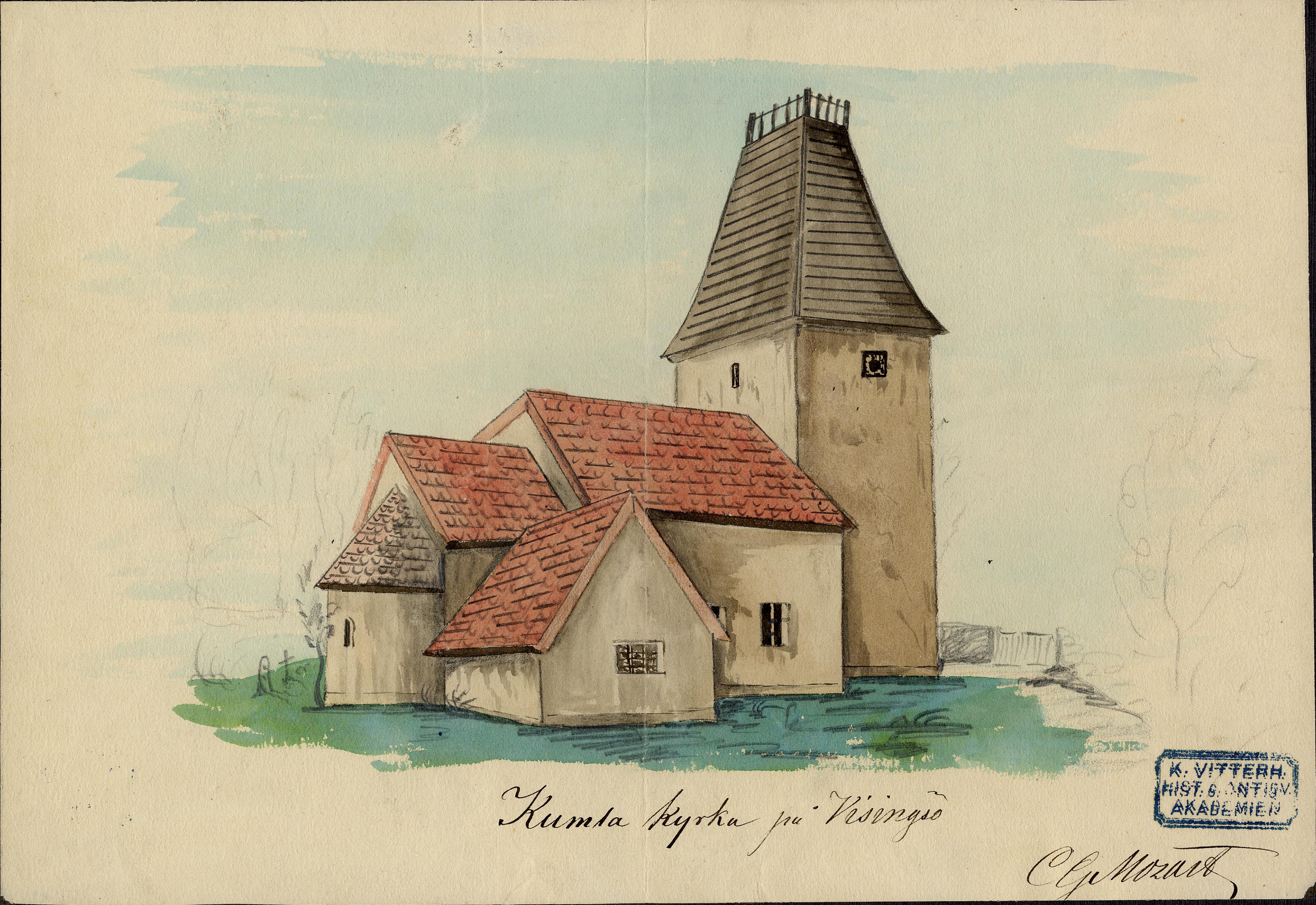 Kyrkan mot nordöst, avbildad på akvarell av Carl Gustaf Mozart.