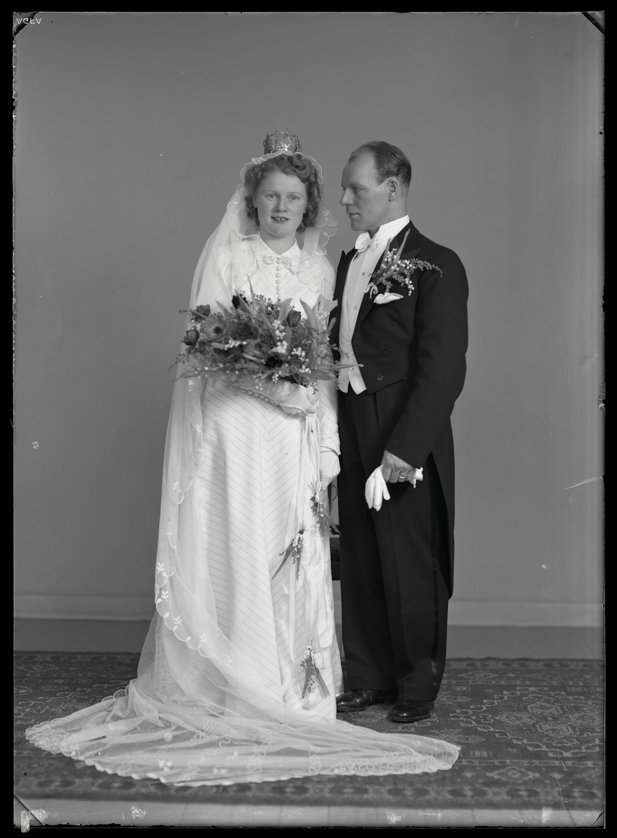 Grupporträtt, brudpar. Karl-Erik Jansson, Oxelby, Kolbäck.