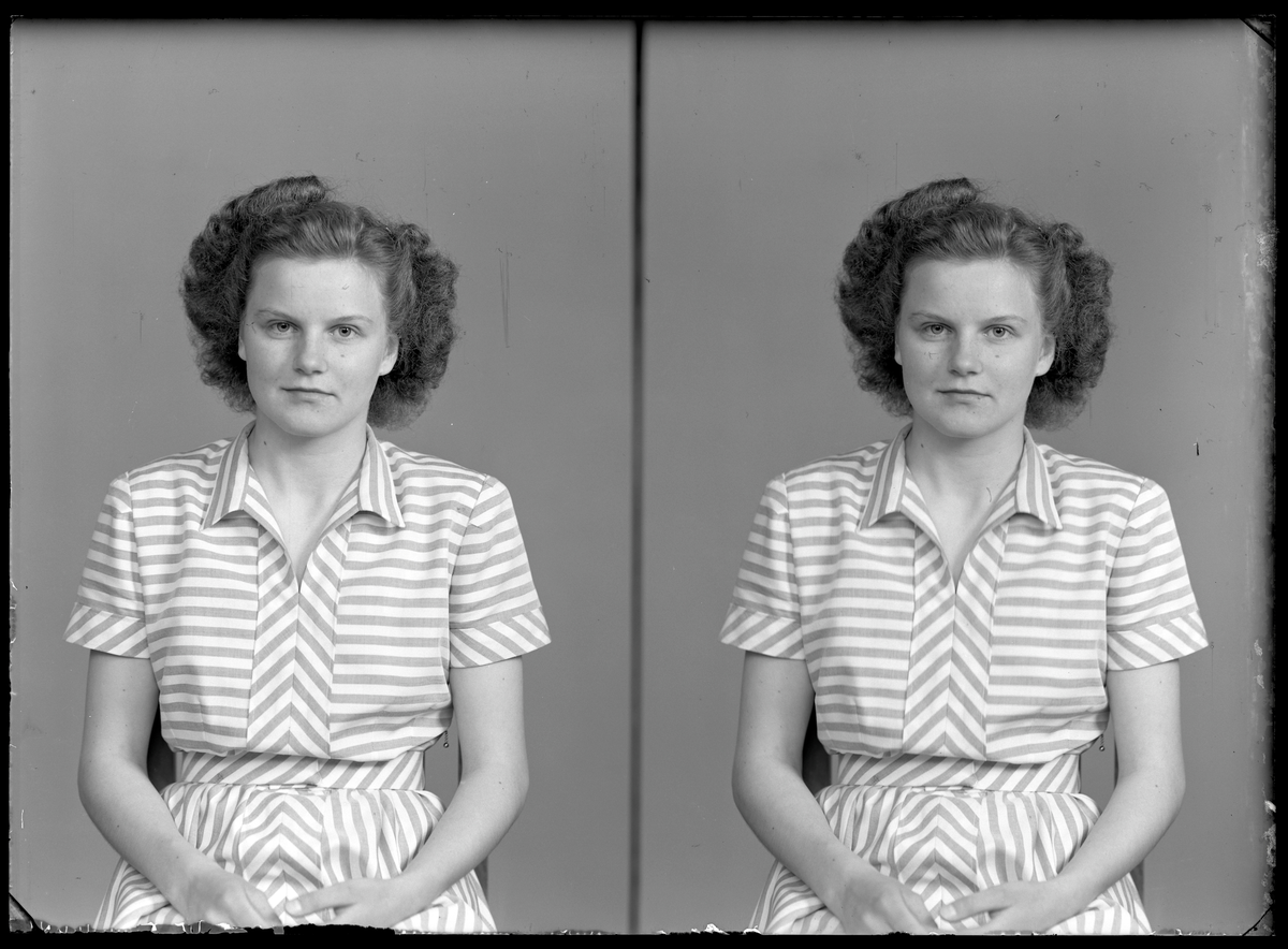 Kvinnoporträtt, pass. Margot Arvidsson, Barnängsgatan 18, Hallstahammar.