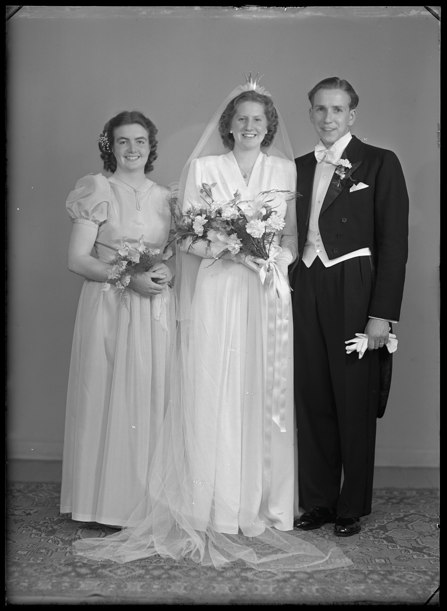 Brudpar och brudtärna. Rune Gustafsson, Box 205, Kolbäck.