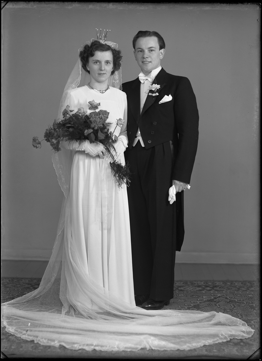 Titel: Grupporträtt, brudpar. Sten Hyltberg, Skogsvägen 25, Västerås. Ur Gustaf Åhmans samling.