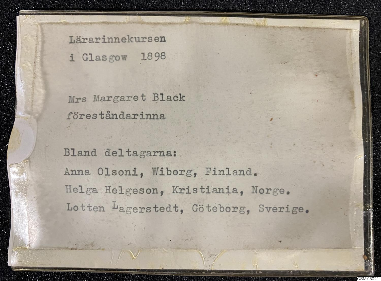 Beskrivning: Ett inramat fotografi föreställande lärerinnekursen i Glasgow 1898. Föreståndarinna v<r Margeret Black. Några andra som deltog var Anna Olsoni, Wiborg, Finland. Helga Helgeson, Kristania, Norge. Lotten Lagerstedt, Göteborg, Sverige.