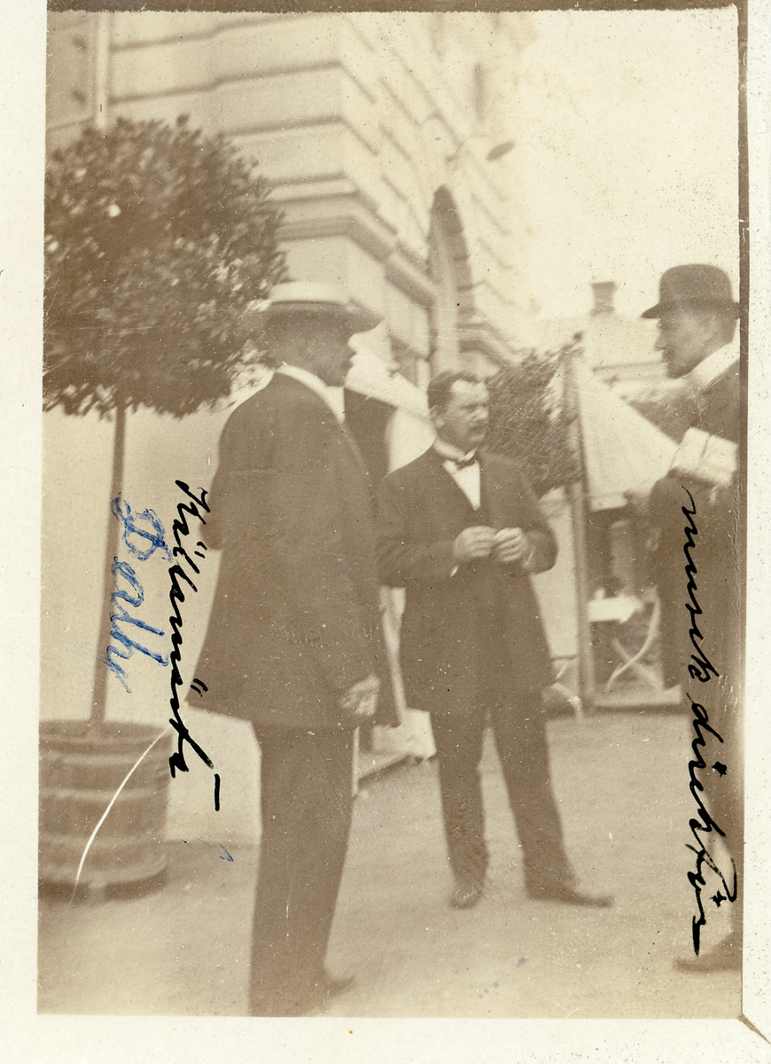 Foto av källarmästare Dahl till vänster och musikdirektör till höger i samtal (enligt text skriven i albumet). Text på baksidan: "Hudigsval den 12/7 -12. Många hälsningar från Hudik, mår utmärkt här uppe, bref imorgon. Olle. Adresserat till Tora Svensson, Uppsala, Flustret".