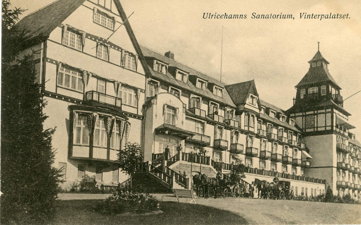 Titel: Brevkort adresserat till sjuksköterskan Amanda Palm. Motiv av Ulricehamns Sanatorium, Vinterpalatset.