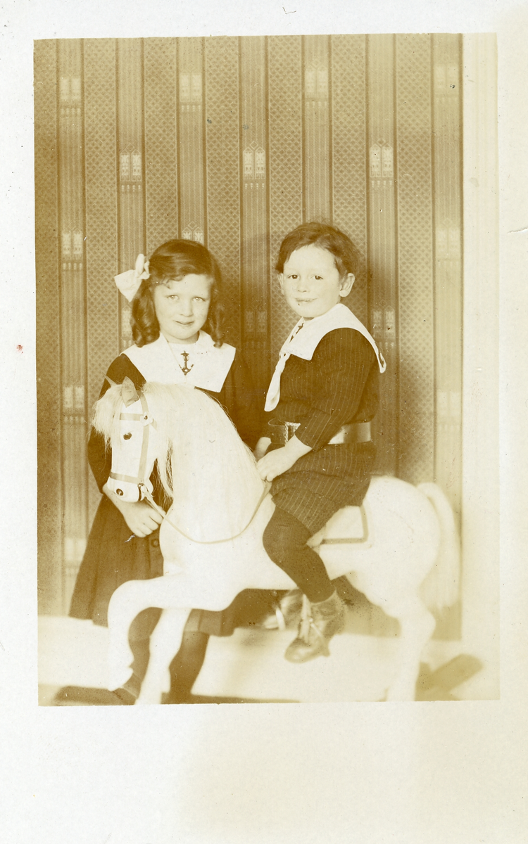 Foto på svåger Johans barn Inga och Sven (enligt text skriven i albumet). Text på baksidan: "Nyköping. En glad påsk önskar eder Sven och Inga samt deras mamma. Pappa är i Malmö och arbetar i Kompaniets villa till utställningen. I söndags var han på Ljungbyhed och under påsk är han i Halmstad. Det skall bli roligt att få hälsa på er om midsommar, hur är det med er lilla flicka? hälsningar från Ida och Elsa, Elsa skall antagligen ha plats på Sotora Hotellet i Trädgården nu till sommaren. Som ni ser är kortet inte alls bra. Många kära hälsningar till svåger och svägerska från Nanny? Inga Sven".