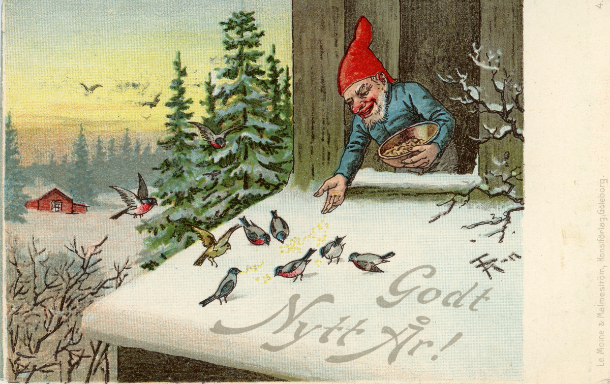 Brevkort adresserat till sjuksköterskan Amanda Palm. Julmotiv av en tomte som matar fåglar. Le Moine & Malmeström, Konstförlag Göteborg.