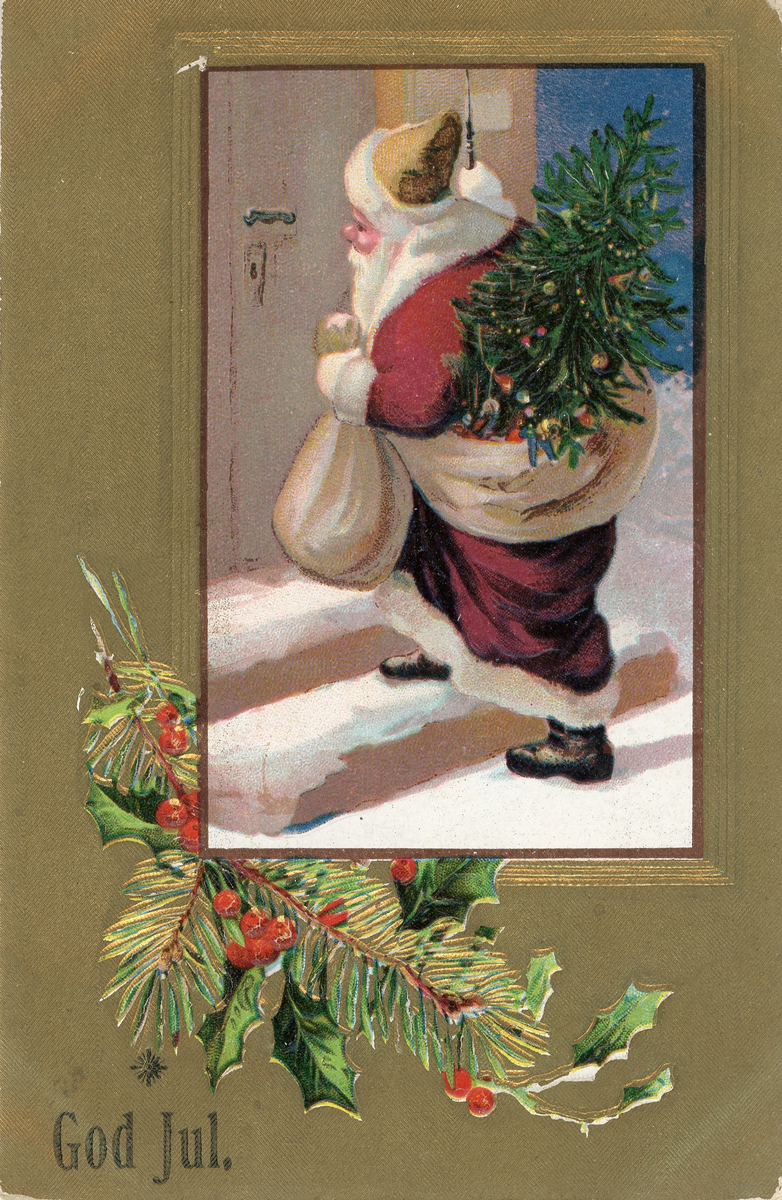 Titel: Brevkort adresserat till sjuksköterskan Amanda Palm. Julkortsmotiv av tomten som är på väg in i någons hem bärandes på en julgran. Text på framsidan: "God Jul". Text på baksidan: "Tillönskas dig! Hjärtligt tack för br. Du skall snart få br. hemifrån. Idag ha vi bakat. Det är så brått nu före jul. Vi är alla friska. Hjärtliga hälsningar från oss alla! Wilhelmina".