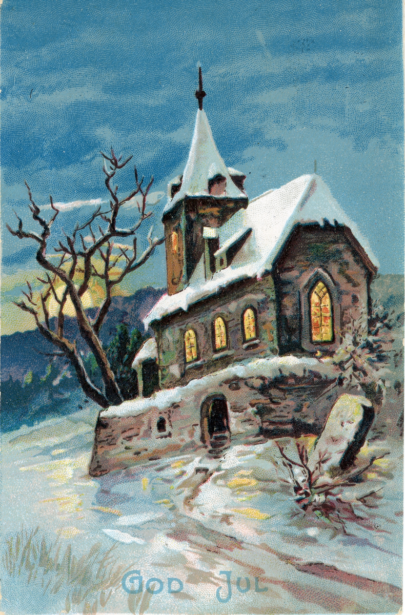 Konstmotiv av en kyrka i vinterskrud i skymningen.