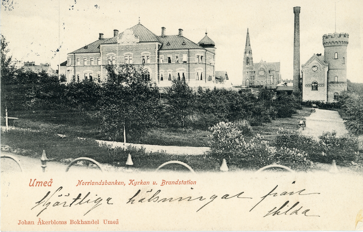 Brevkort adresserat till sjuksköterskan Amanda Palm 1902. Motiv av Norrlandsbanken, Kyrkan och Brandstation i Umeå. Johan Åkerbloms Bokhandel, Umeå.
