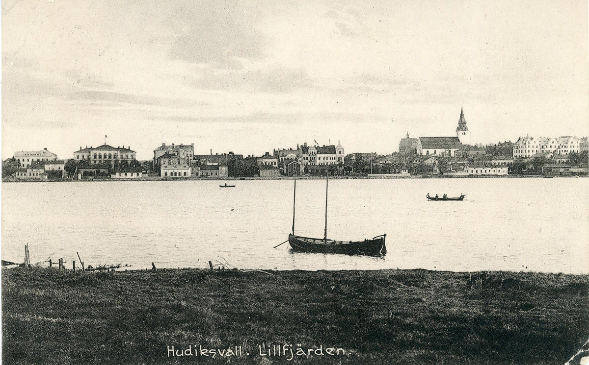 Motiv av Lillfjärden i Hudiksvall med byggnader i bakgrunden.