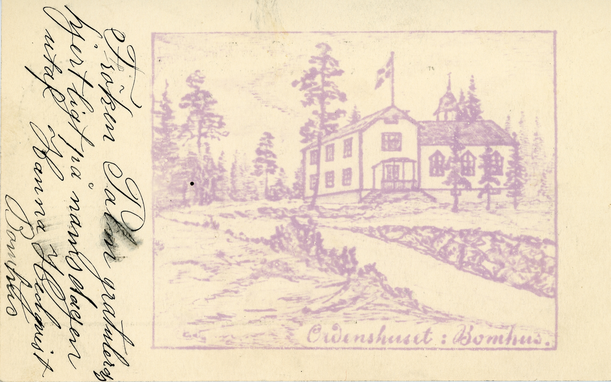 Titel: Brevkort adresserat till sjuksköterskan Amanda Palm. Motiv av ordenshuset i Bomhus, 1903. Text på framsidan: "Fröken Palm gratuleras hjertligt på namnsdagen utaf Hanna Hedqvist Bomhus".