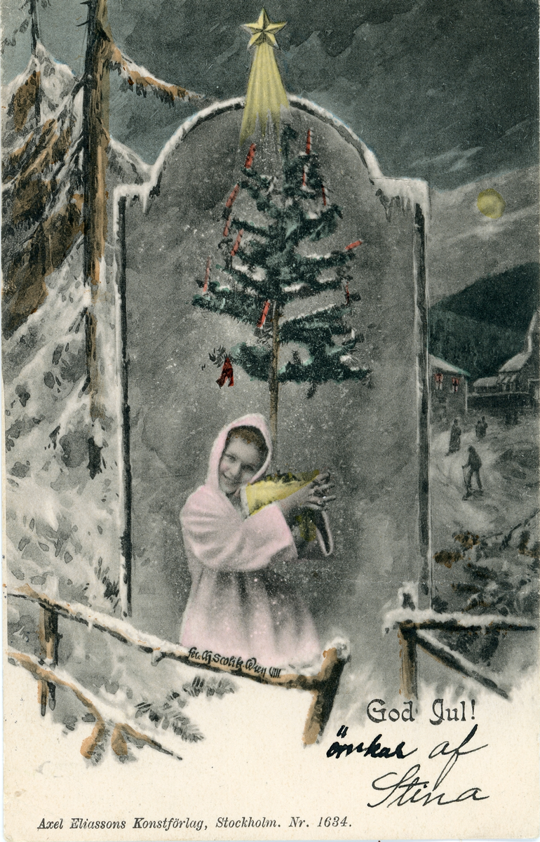 Brevkort adresserat till sjuksköterskan Amanda Palm. Motiv av en flicka som håller i en julgran och stjärna som lyser starkt ovanför henne.