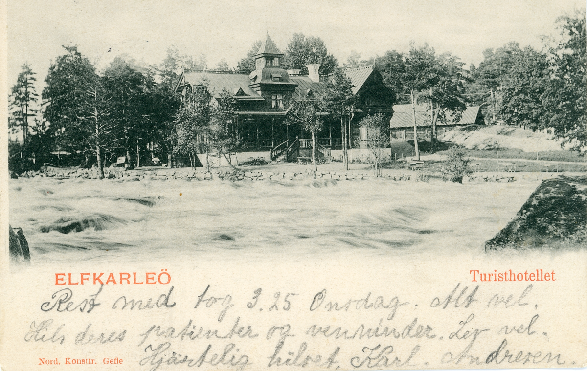 Motiv av Turisthotellet i Elfkarleö med träd och älven i förgrunden.