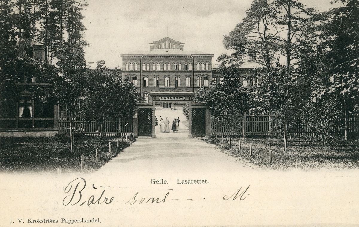 Kortmotiv av Gefle Lasarett från J. V Krokströms Pappershandel. Text på framsidan kort: "Bättre sent ... M".