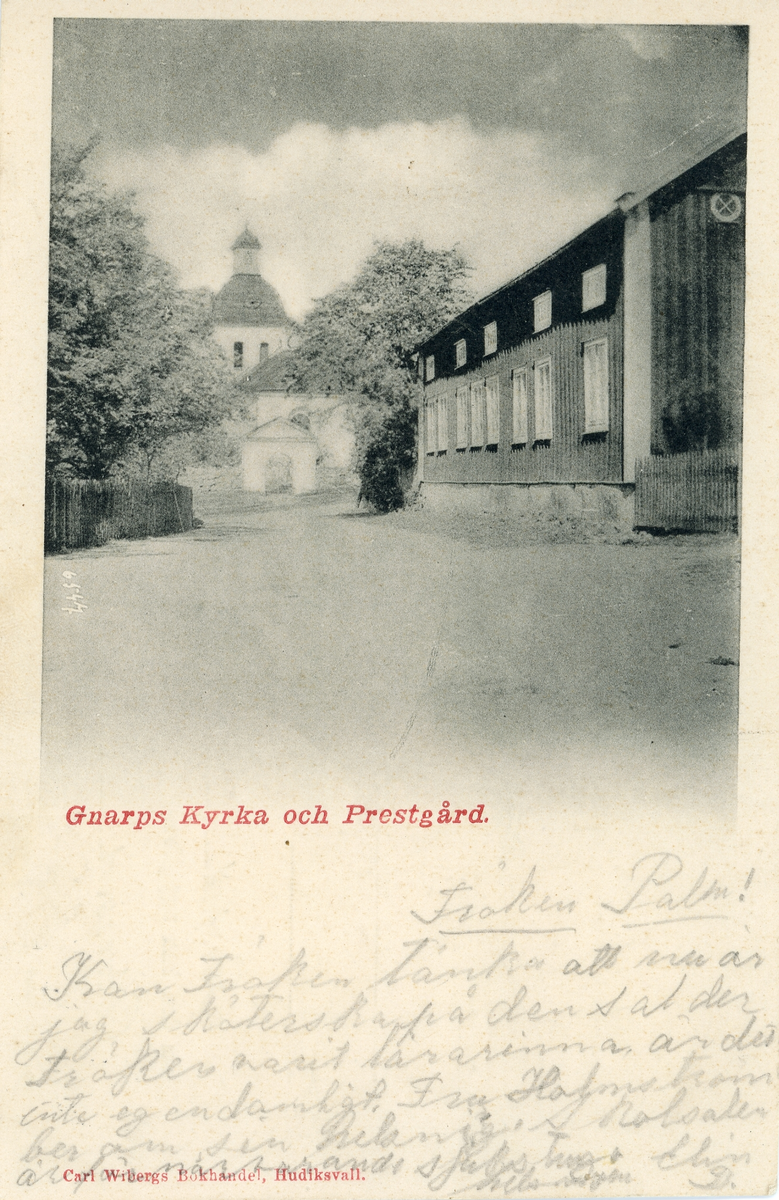 Brevkort adresserat till sjuksköterskan Amanda Palm, 1903. Motiv av Gnarps kyrka och prästgård. Carl Wibergs Bokhandel, Hudiksvall.