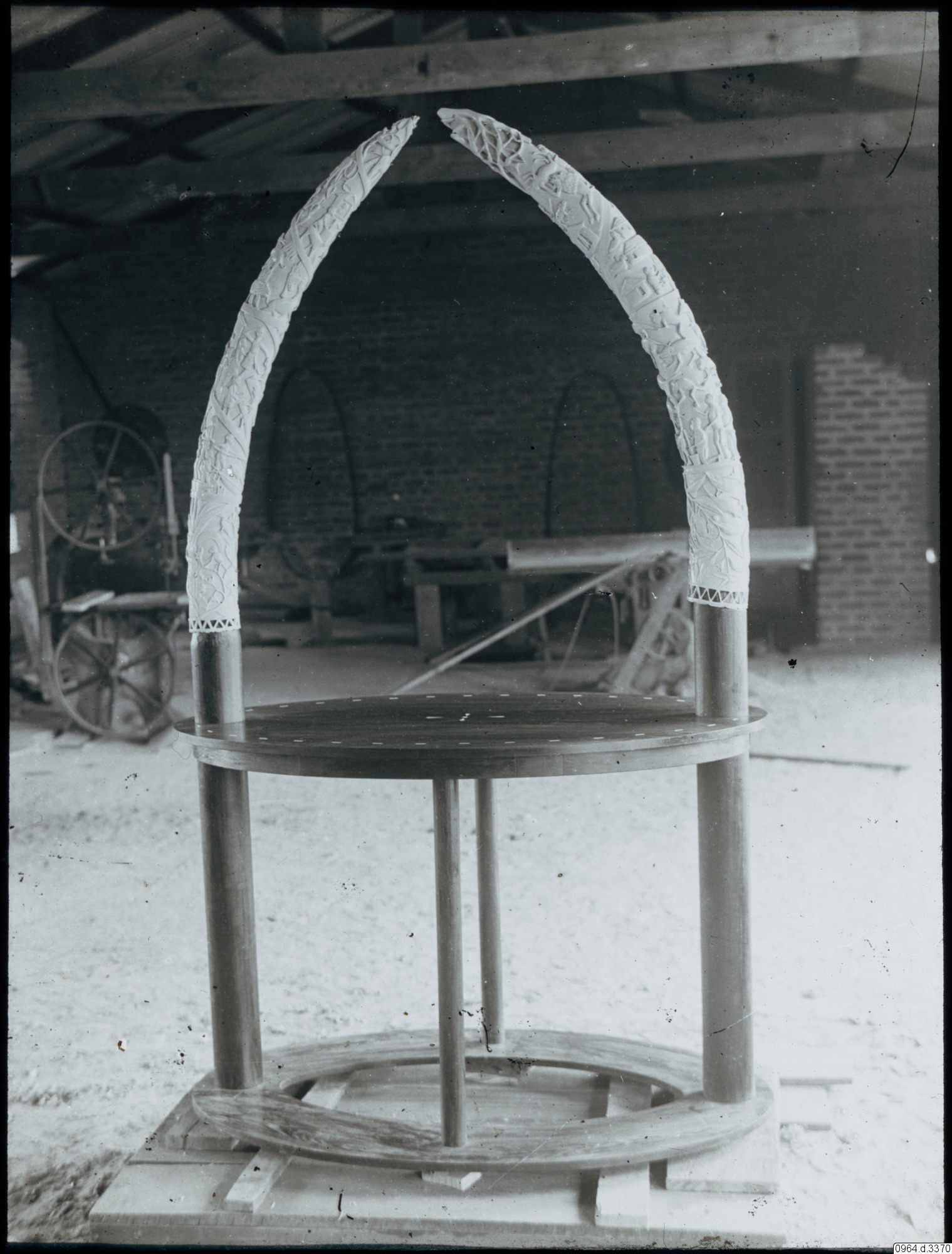 Bord med snidade elefantbetar. Trofébord i snickeriverkstad.
