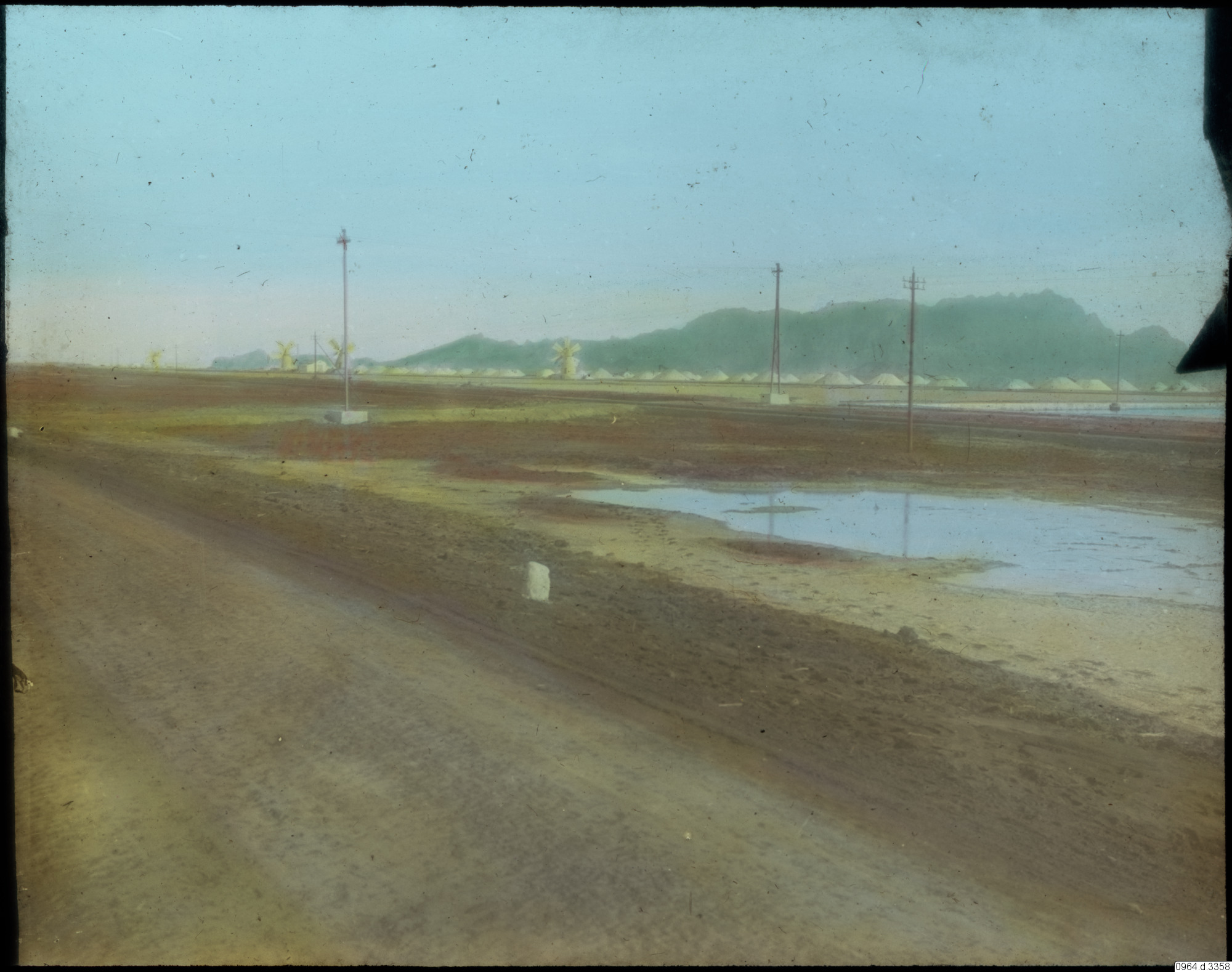 Landskap med väg, järnväg och väderkvarnar. Saltutvinning med salthögar? Telefonledningar? Telefonstolpar?