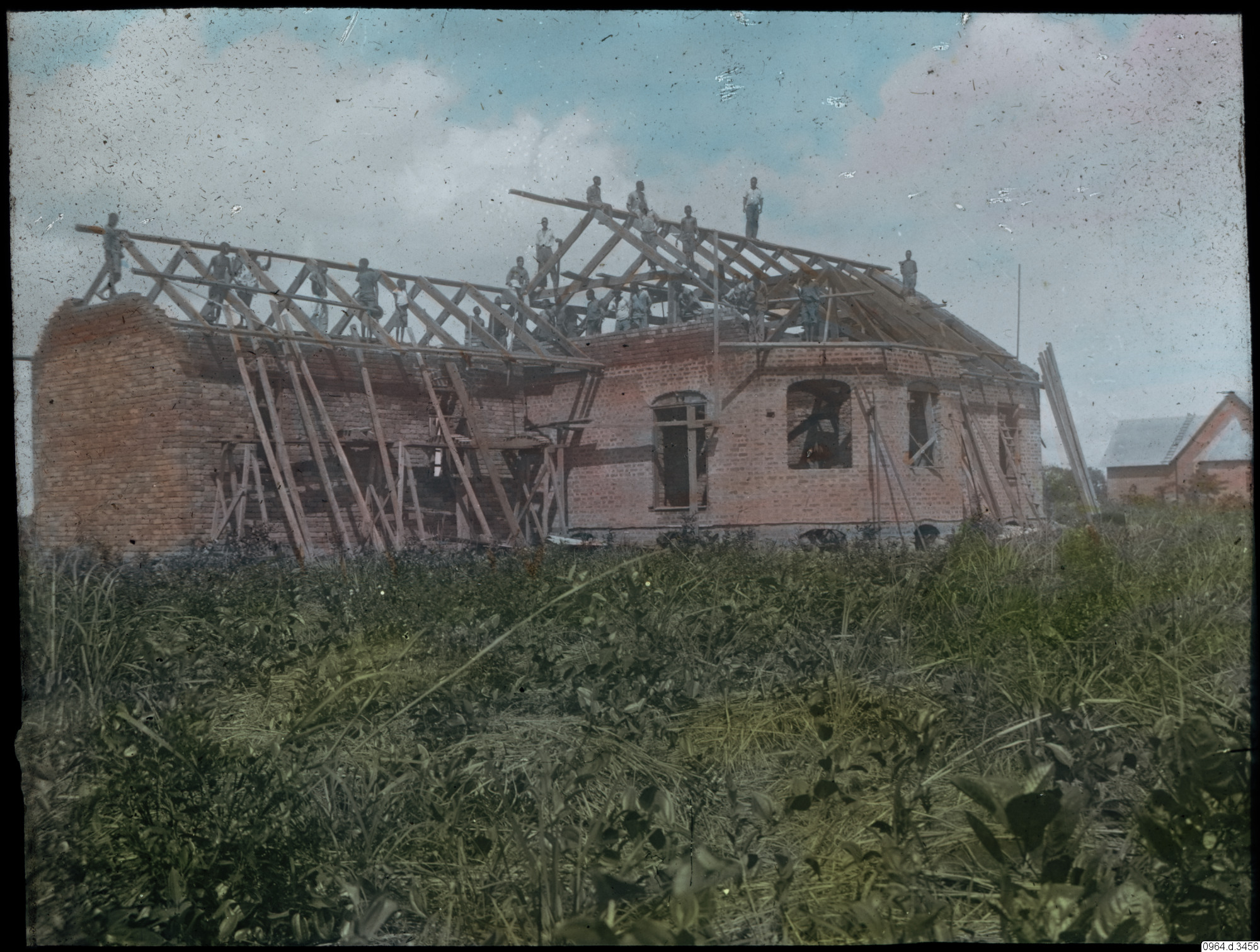 Byggnad under uppförande, takbjälkar och arbetare.