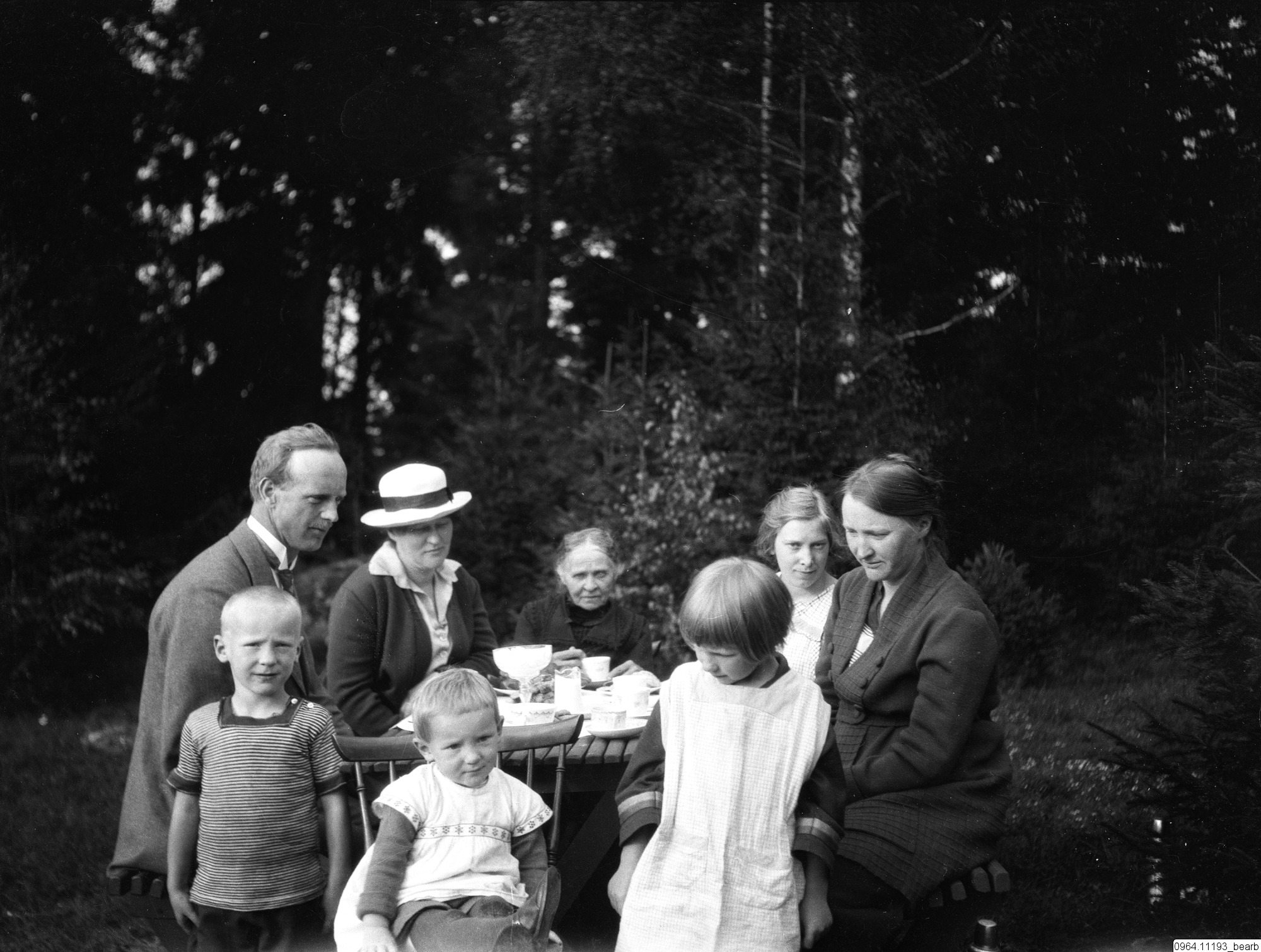 Tre vuxna och fyra barn. Kvinnan är sannolikt Björkdahl.