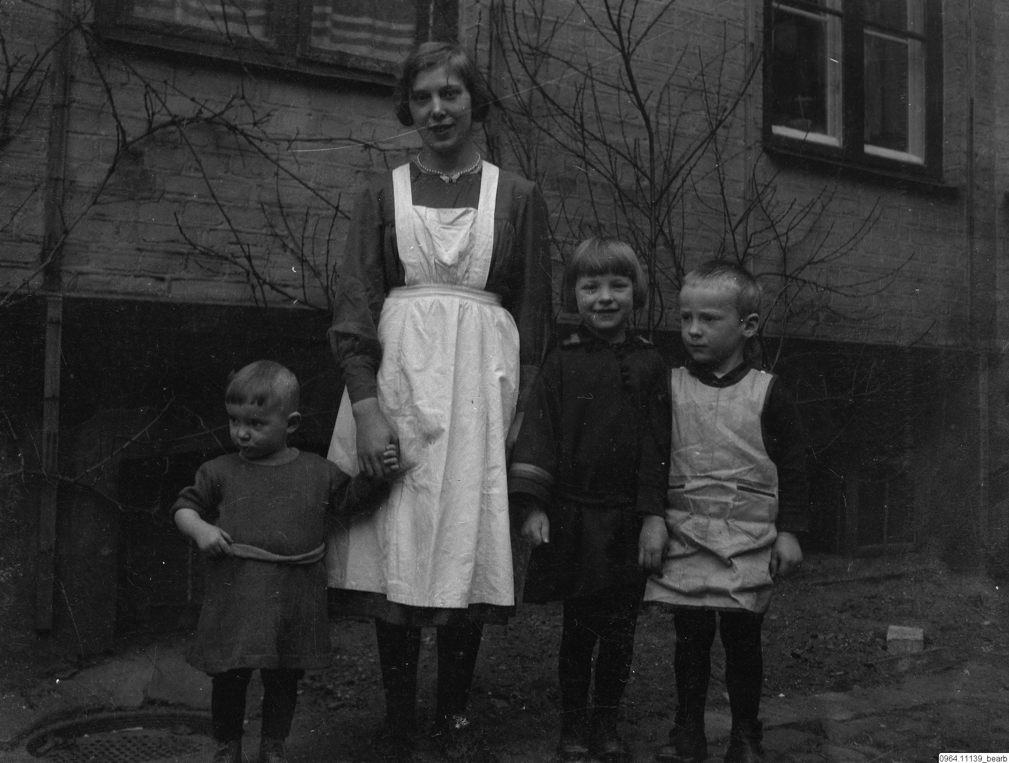 Kvinna (piga? köksbiträde? tjänstekvinna?) med tre barn (missionärsbarn?).