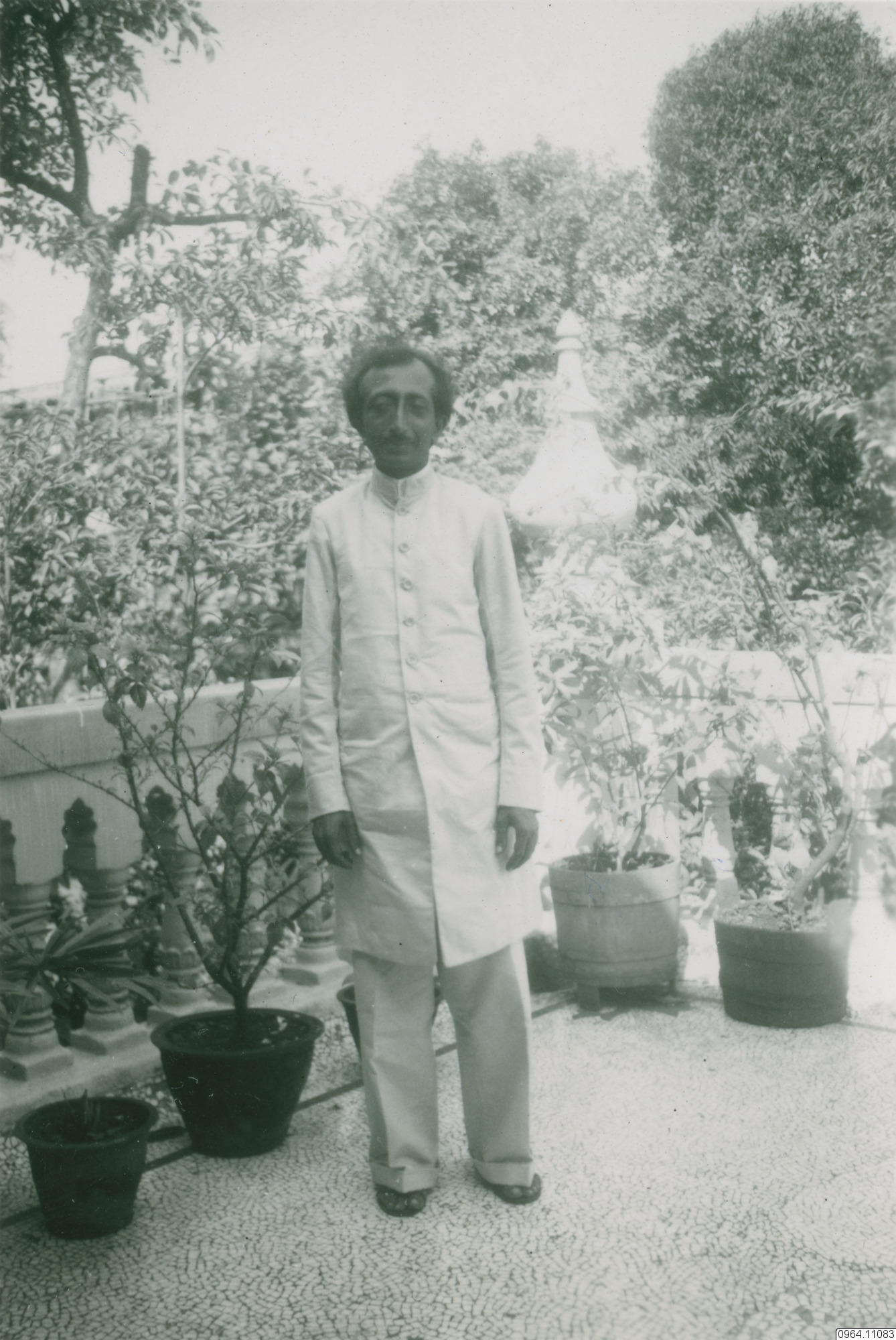 Man, Jacob Asi, i arbetskläder som står utomhus i trädgård framför blomkrukor.