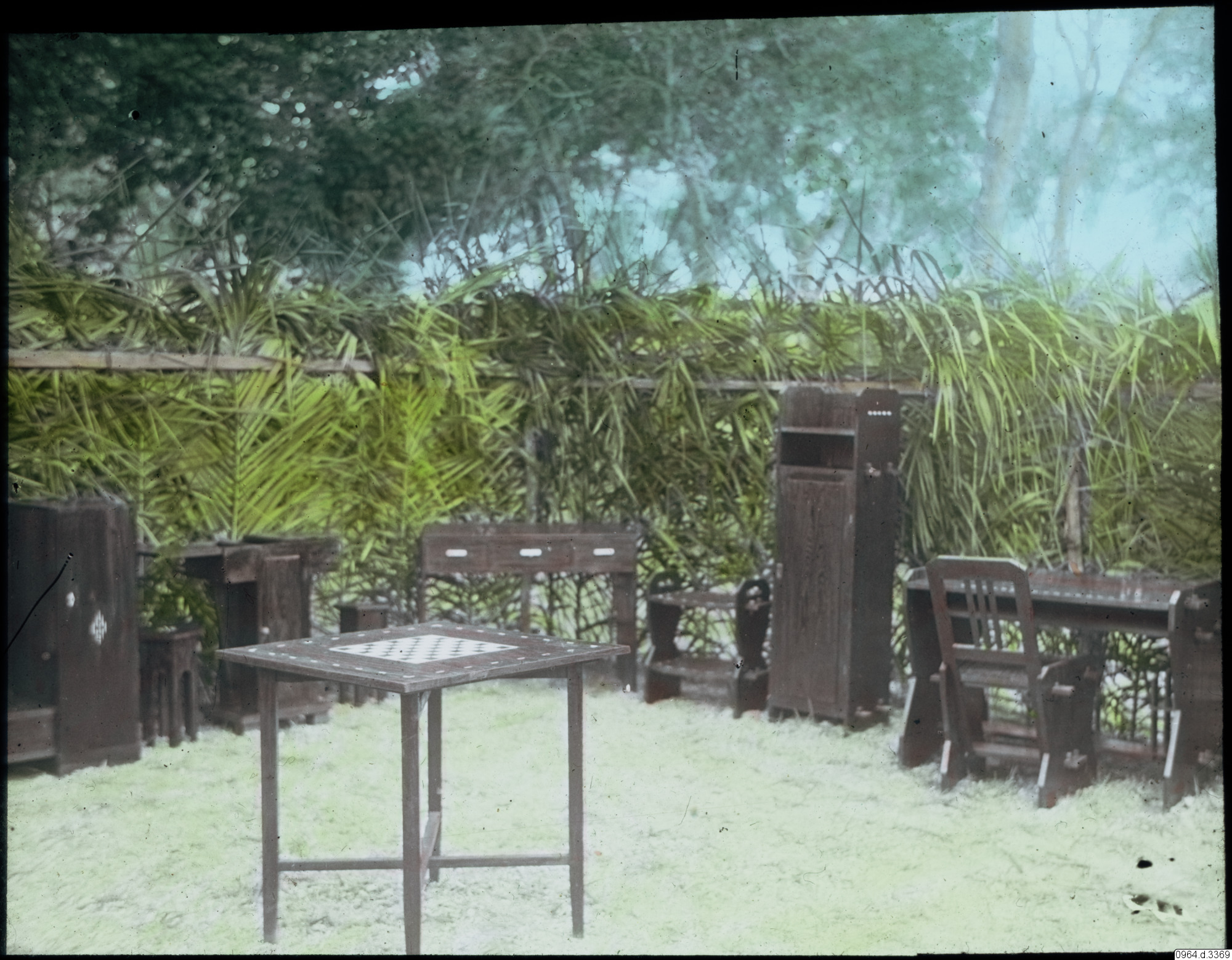schack, möbler, palmkvistar, bord, utställning [?], yrkesskola [?], fotografi, photograph