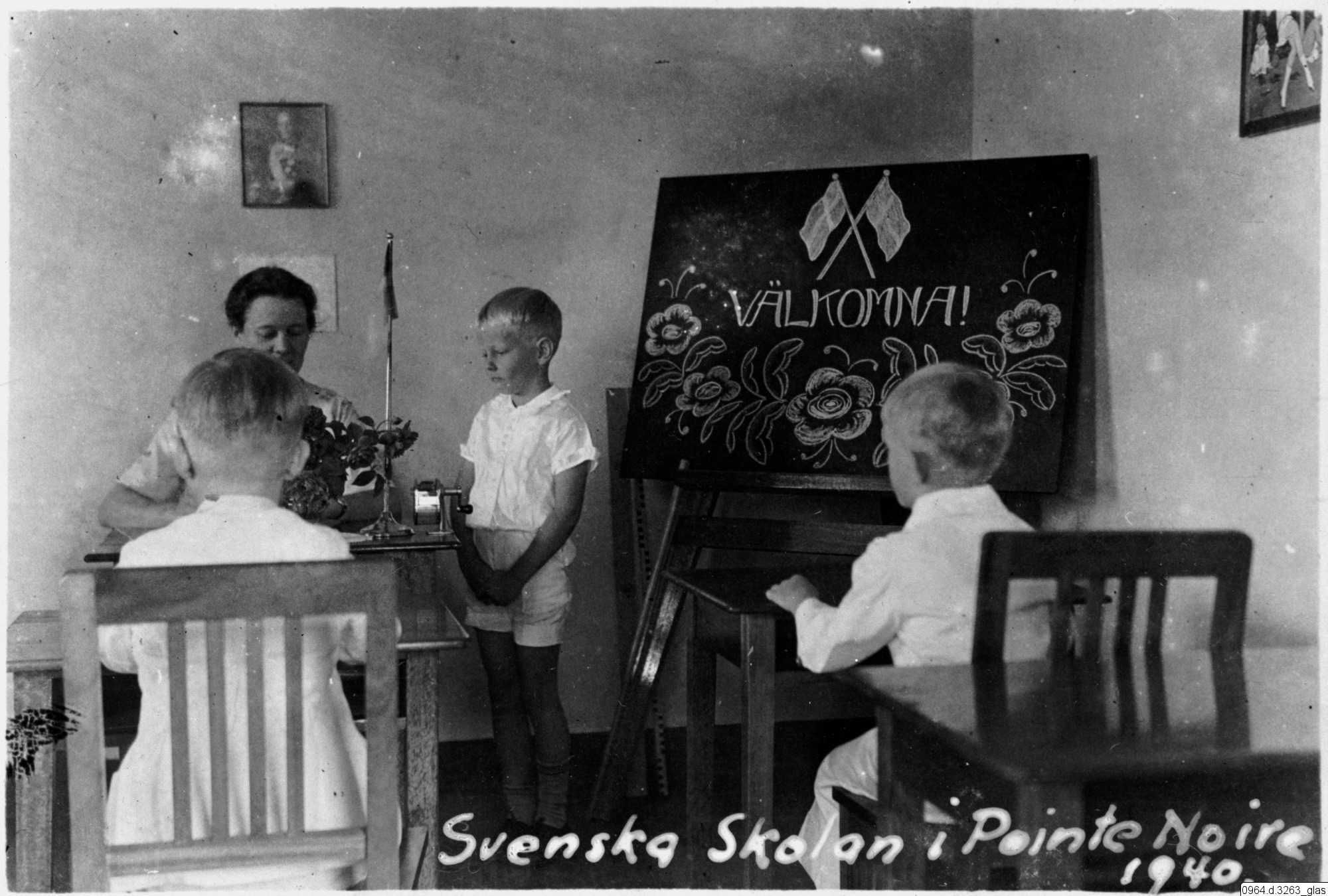 Svenska Skolan i Pointe Noire 1940. Elever och lärare i klassrum.