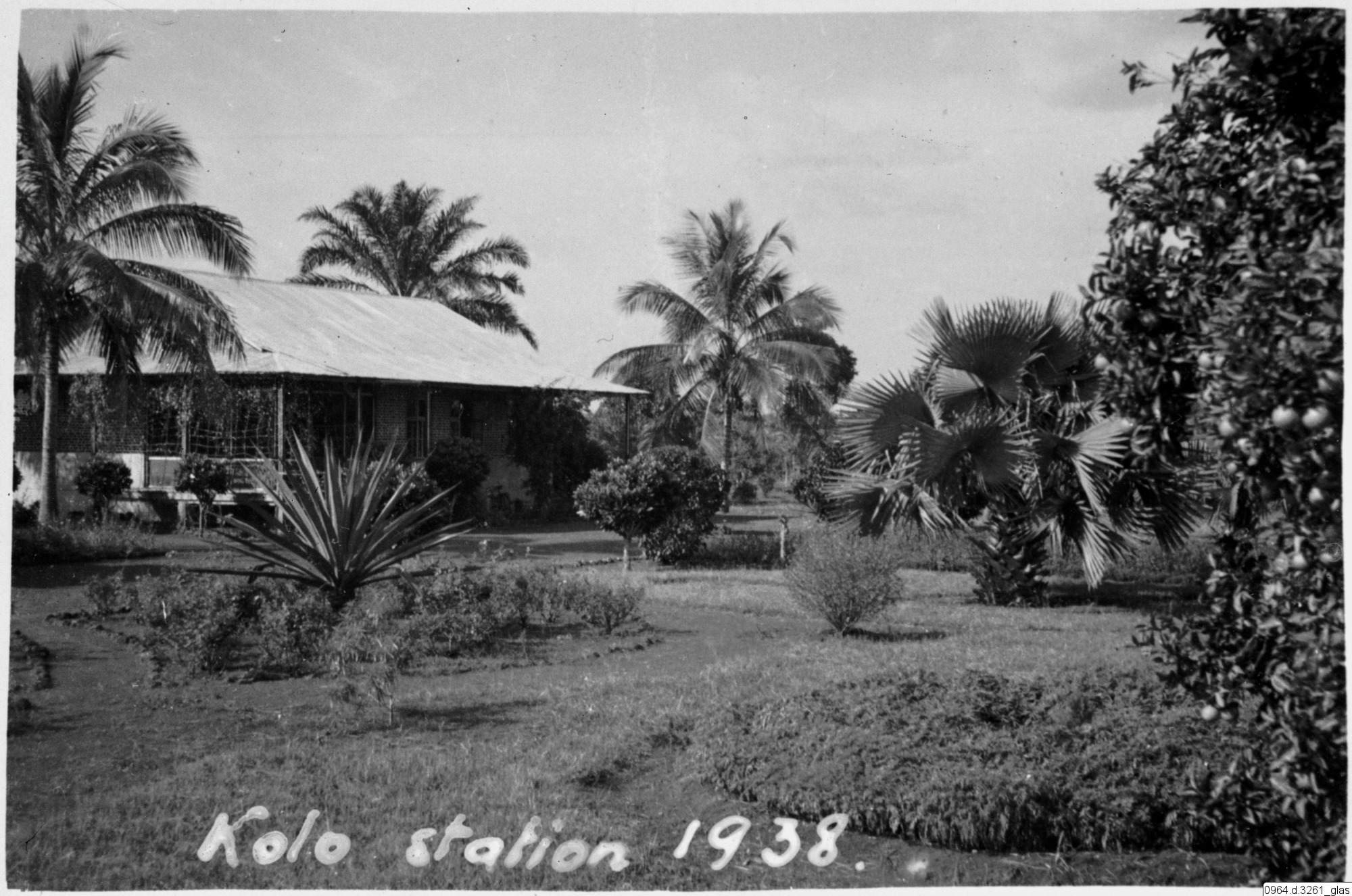 missionsstation, byggnad, palmer, trädgård, fruktträd, veranda, fotografi, photograph