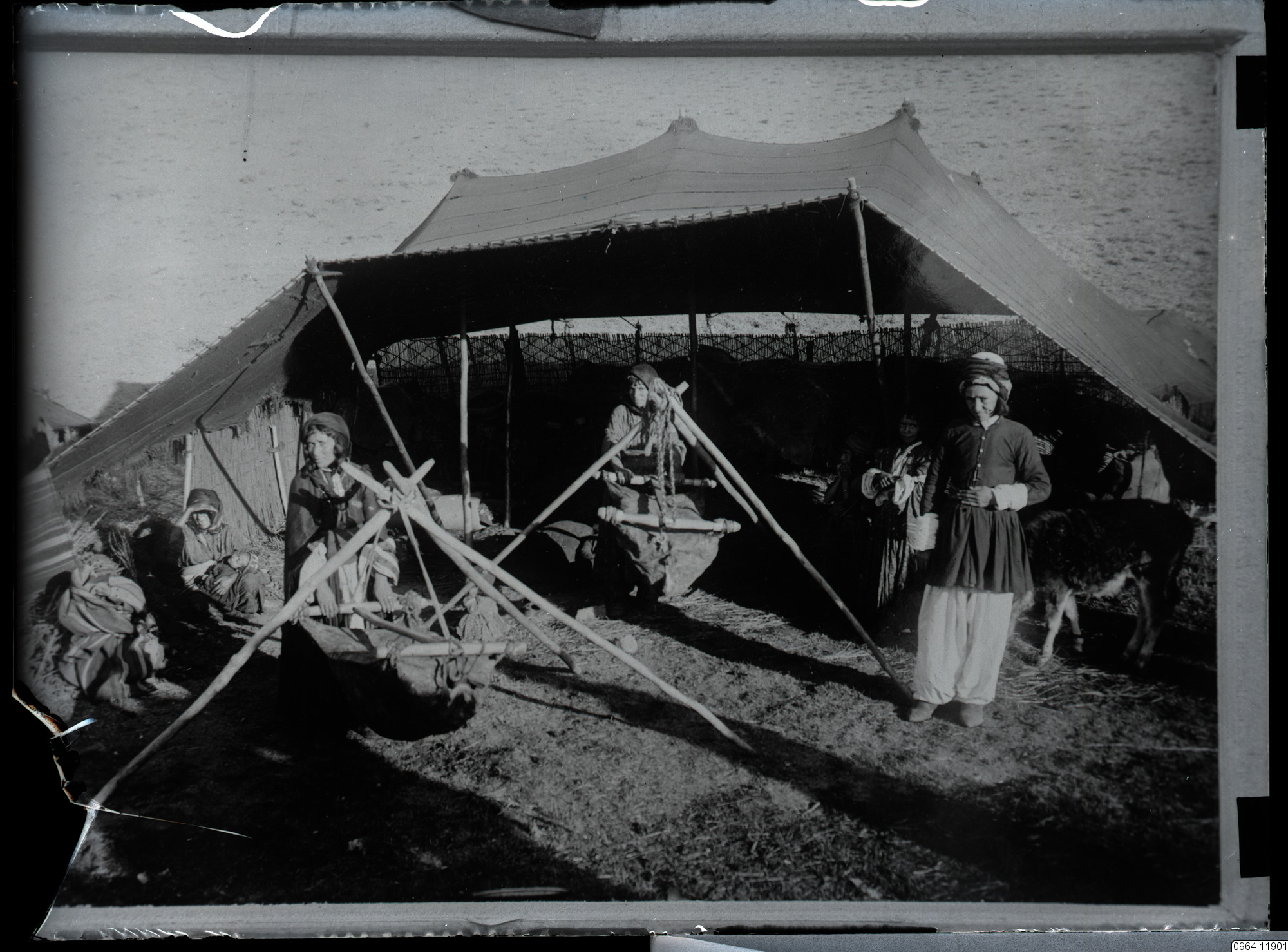 Vy över…kurdisk sommarplats i Persien. Kurdiska kvinnor kärna smör från surmjölk.