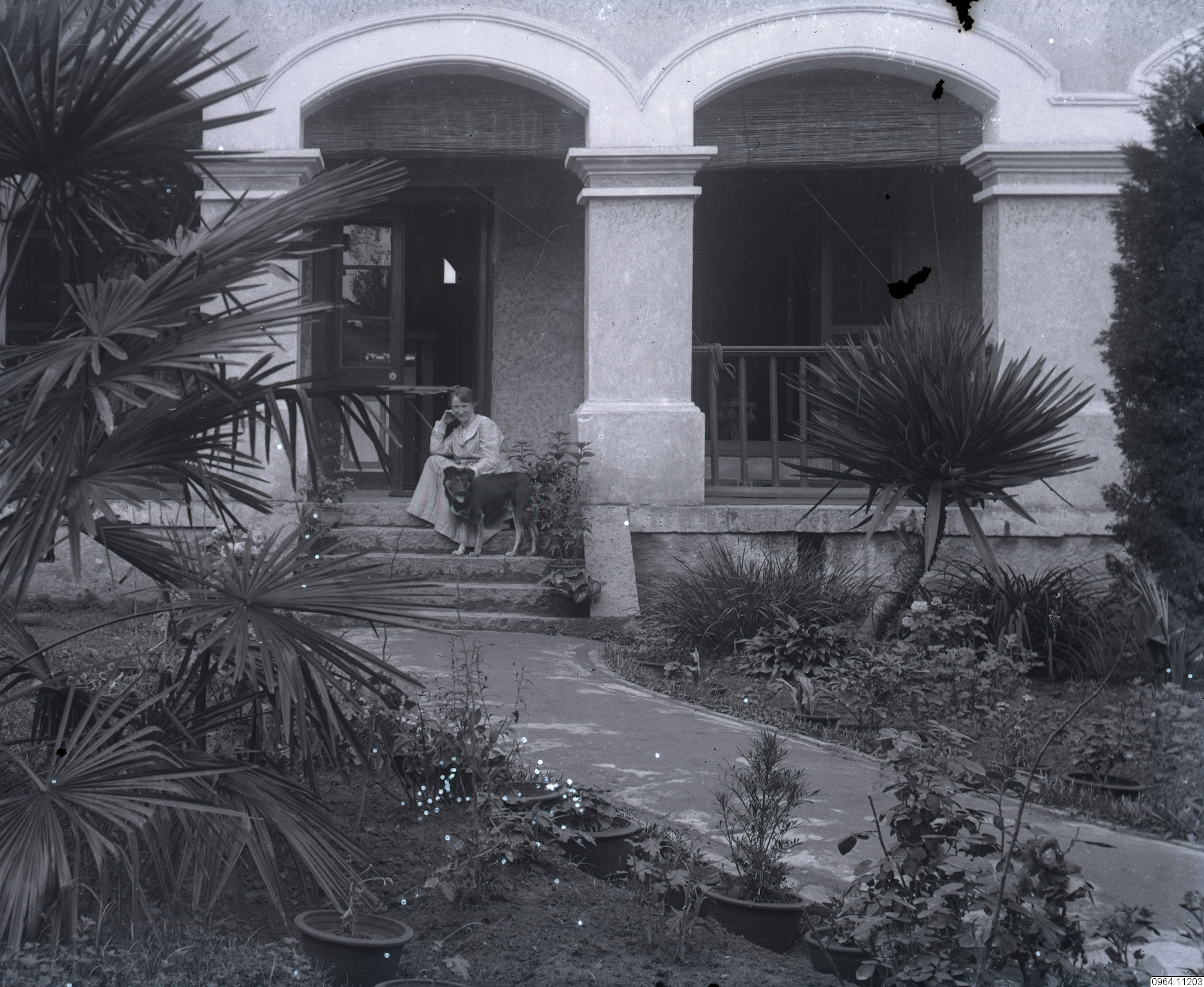 Kvinna som sitter på trappan utanför stort hus med hund.