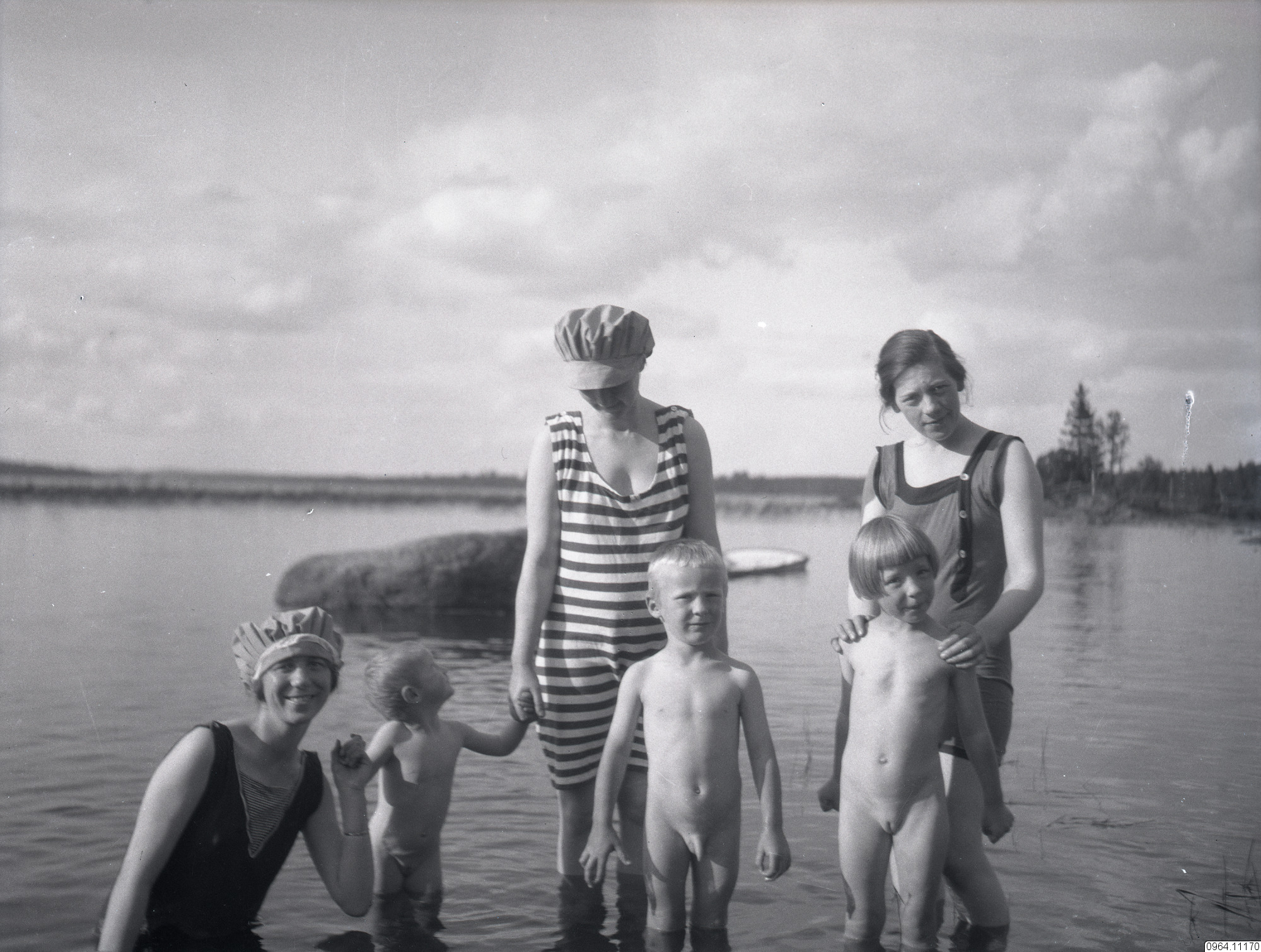 Tre kvinnor och tre barn som badar.