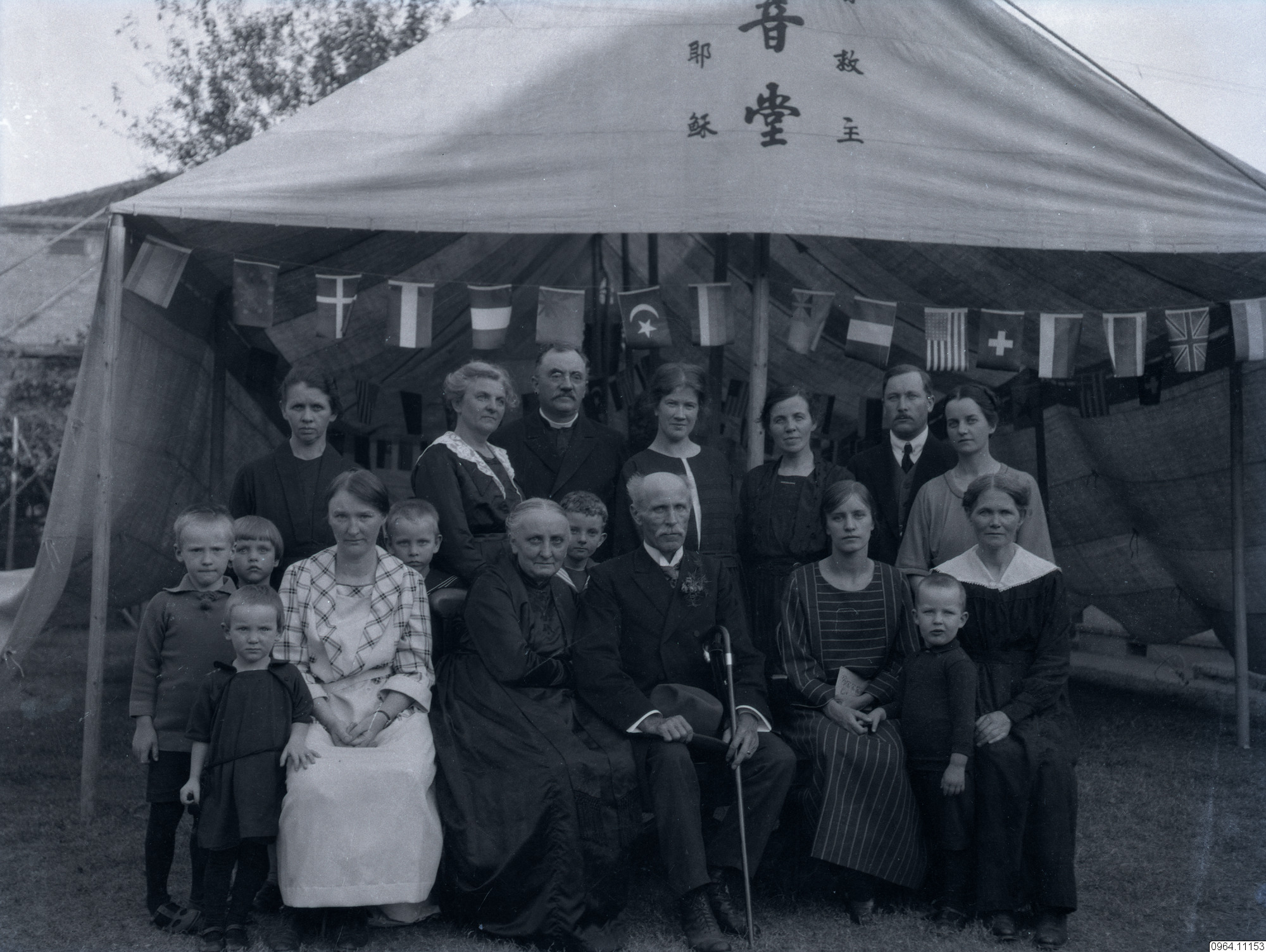 Gruppbild med vuxna och barn i ett tält med kinesiska tecken.