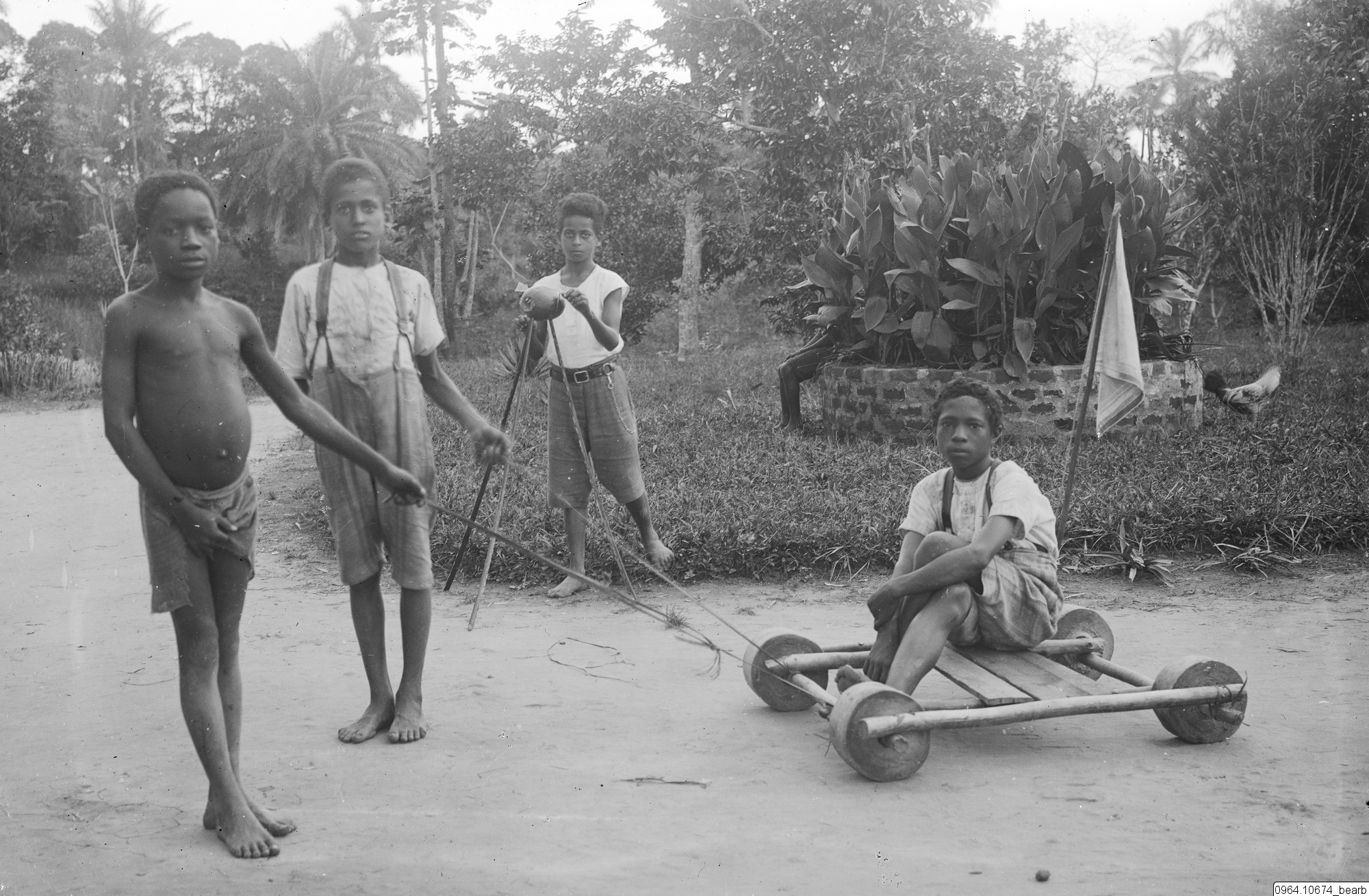 Barn som leker, bland annat med en lådbil eller vagn.