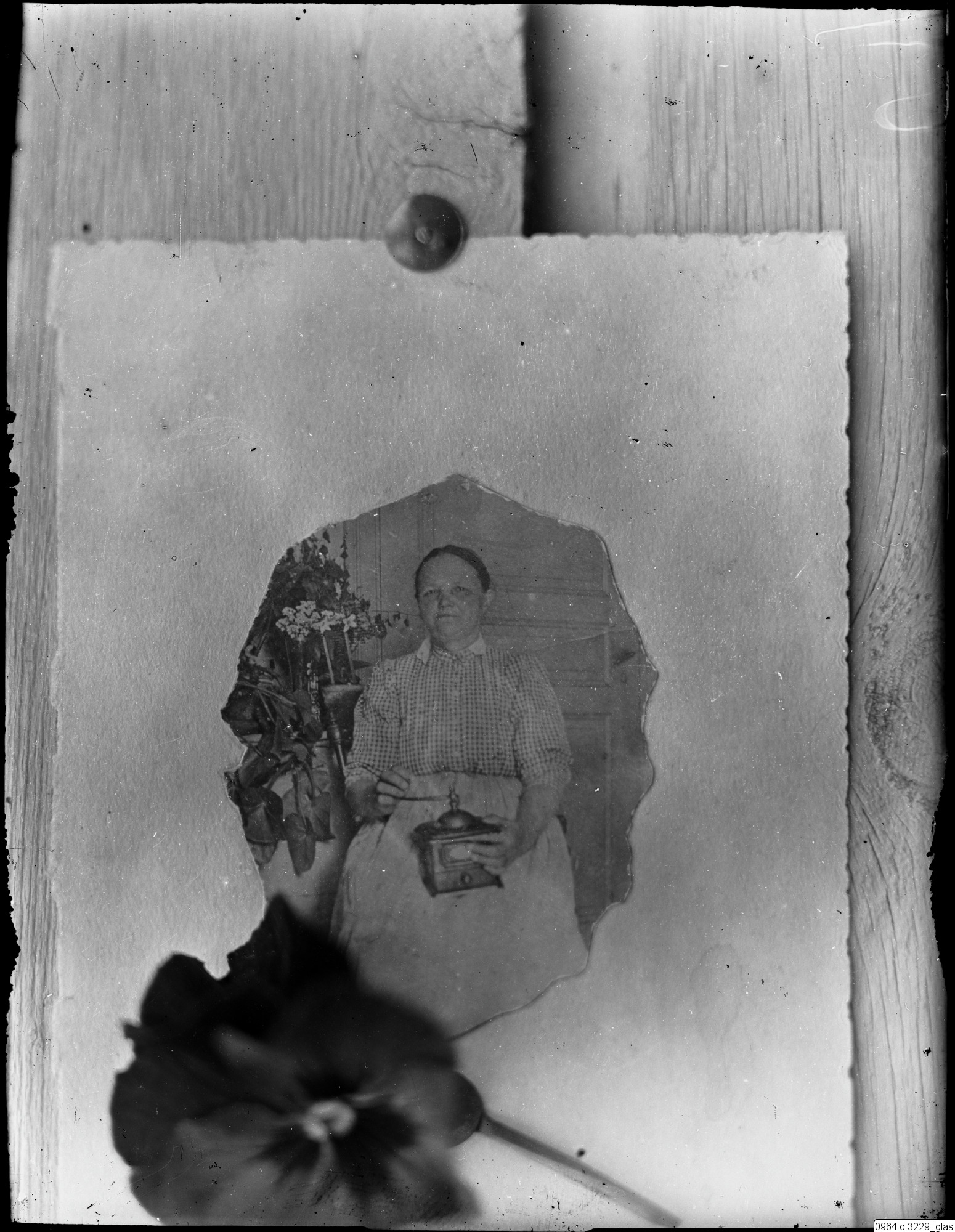 Fotografi av foto, sittande kvinna med kaffekvarn i famnen. Pensée.